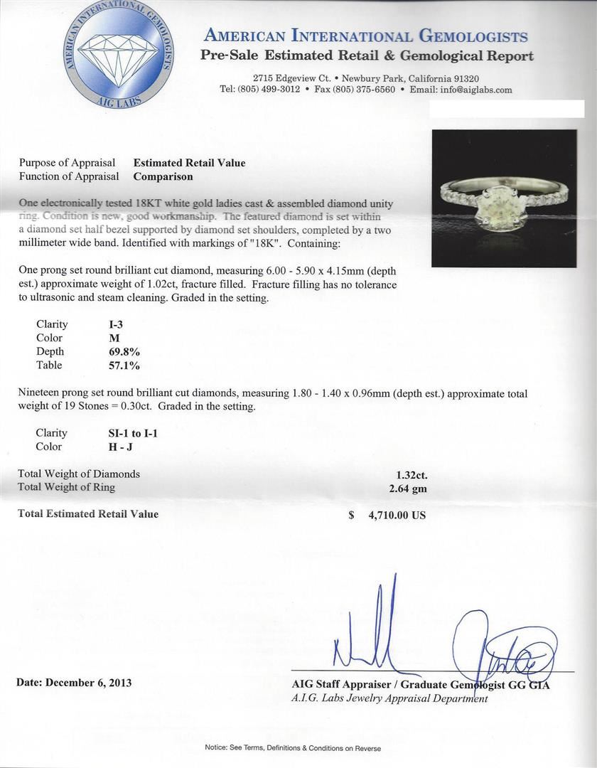 One electronically tested 18KT white gold ladies cast & assembled diamond unity ring. Condition is new, good workmanship. The featured diamond is set within a diamond set half bezel supported by diamond set shoulders, completed by a two millimeter wide band. Identified with markings of "18K". Containing: One prong set round brilliant cut diamond, measuring 6.00 - 5.90 x 4.15mm (depth est.) approximate weight of 1.02ct, fracture filled. Fracture filling has no tolerance to ultrasonic and steam cleaning. Graded in the setting. Clarity: I-3. Color: M. Depth: 69.8%. Table: 57.1%. Nineteen prong set round brilliant cut diamonds, measuring 1.80 - 1.40 x 0.96mm (depth est.) approximate total weight of 19 Stones = 0.30ct. Graded in the setting. Clarity: SI-1 to I-1. Color: H - J. Total Weight of Diamonds: 1.32ct. Total Weight of Ring: 2.64 gm. AIG Appraised at $4,710.00.