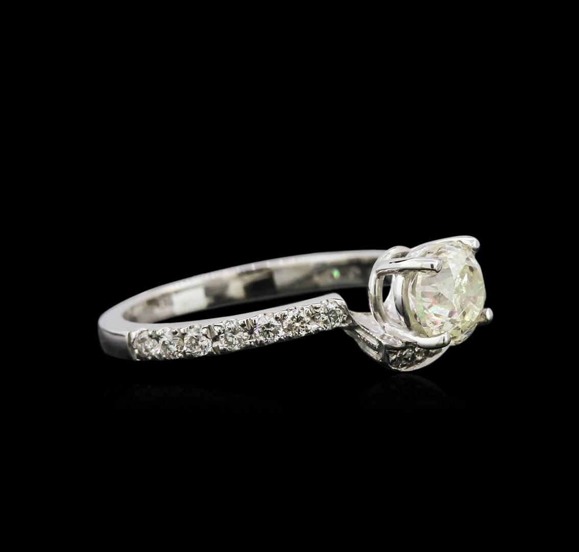 One electronically tested 18KT white gold ladies cast & assembled diamond unity ring. Condition is new, good workmanship. The featured diamond is set within a diamond set half bezel supported by diamond set shoulders, completed by a two millimeter wide band. Identified with markings of "18K". Containing: One prong set round brilliant cut diamond, measuring 6.00 - 5.90 x 4.15mm (depth est.) approximate weight of 1.02ct, fracture filled. Fracture filling has no tolerance to ultrasonic and steam cleaning. Graded in the setting. Clarity: I-3. Color: M. Depth: 69.8%. Table: 57.1%. Nineteen prong set round brilliant cut diamonds, measuring 1.80 - 1.40 x 0.96mm (depth est.) approximate total weight of 19 Stones = 0.30ct. Graded in the setting. Clarity: SI-1 to I-1. Color: H - J. Total Weight of Diamonds: 1.32ct. Total Weight of Ring: 2.64 gm. AIG Appraised at $4,710.00.