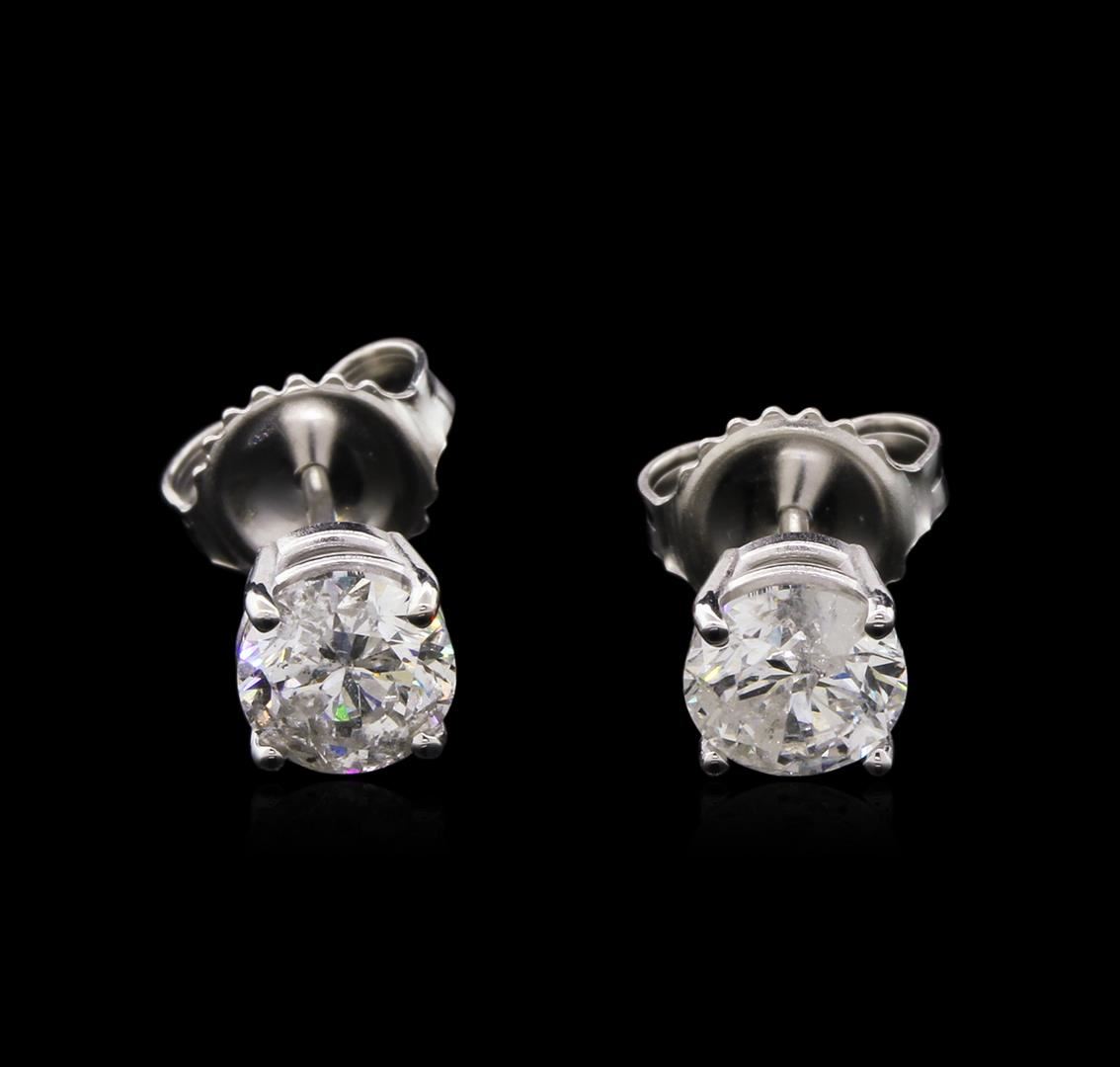One pair electronically tested 14KT white gold cast & assembled diamond solitaire earrings with standard backs. Identified with markings of "14K". Condition is new, good workmanship. Containing: One prong set round brilliant cut diamond, measuring 5.50 - 5.50 x 3.50mm (depth est.), 5.00% GTCF approximate weight of 0.68ct. Graded in the setting. Clarity: I-2. Color: I. Depth 63.6%. Table 58.2%. One prong set round brilliant cut diamond, measuring 5.50 - 5.40 x 3.50mm (depth est.), 1.00% GTCF approximate weight of 0.64ct. Graded in the setting. Clarity: I-2. Color: I. Depth 64.2%. Table 60.6%. Total Weight of Diamonds 1.32ct. Total Weight of Earrings 1.26gm. AIG Appraised at $4,325.00.