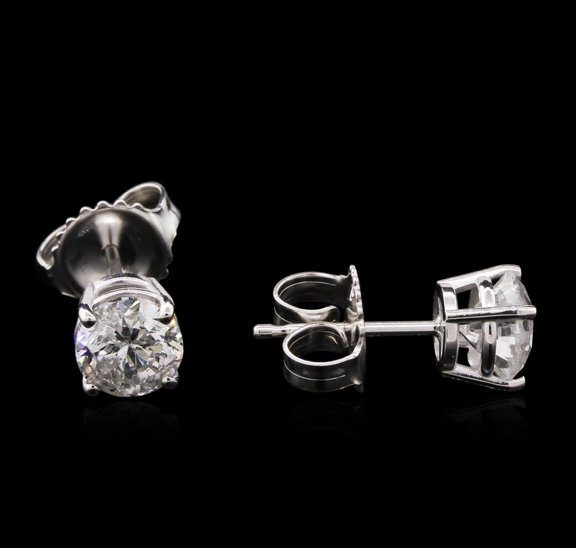 One pair electronically tested 14KT white gold cast & assembled diamond solitaire earrings with standard backs. Identified with markings of "14K". Condition is new, good workmanship. Containing: One prong set round brilliant cut diamond, measuring 5.50 - 5.50 x 3.50mm (depth est.), 5.00% GTCF approximate weight of 0.68ct. Graded in the setting. Clarity: I-2. Color: I. Depth 63.6%. Table 58.2%. One prong set round brilliant cut diamond, measuring 5.50 - 5.40 x 3.50mm (depth est.), 1.00% GTCF approximate weight of 0.64ct. Graded in the setting. Clarity: I-2. Color: I. Depth 64.2%. Table 60.6%. Total Weight of Diamonds 1.32ct. Total Weight of Earrings 1.26gm. AIG Appraised at $4,325.00.