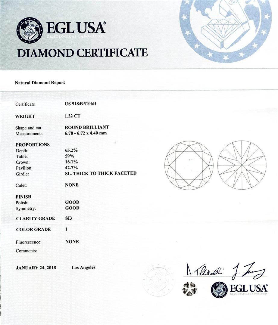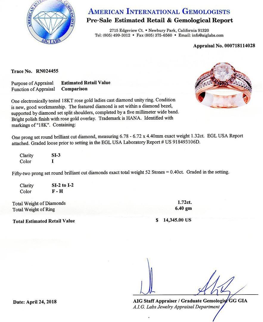 1.32ct SI3 CLARITY CENTER Diamond 18K Rose Gold Unity Ring (1.72ctw Diamonds) EGL USA CERTIFIED. One electronically tested 18KT rose gold ladies cast diamond unity ring. Condition is new, good workmanship. The featured diamond is set within a diamond bezel, supported by diamond set split shoulders, completed by a five millimeter wide band. Bright polish finish with rose gold overlay. Trademark is HANA. Identified with markings of "18K". Containing: One prong set round brilliant cut diamond, measuring 6.78mm to 6.72mm x 4.40mm exact weight 1.32ct. EGL USA Report attached. Graded loose prior to setting in the EGL USA Laboratory Report US 918493106D. Clarity SI3 Color I Fifty-two prong set round brilliant cut diamonds exact total weight 52 Stones = 0.40ct. Graded in the setting. Clarity SI2 to I2 Color F - H Total Weight of Diamonds 1.72ct. Total Weight of Ring 6.40 gm