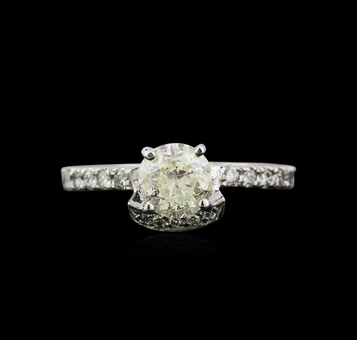 One electronically tested 18KT white gold ladies cast & assembled diamond unity ring. Condition is new, good workmanship. The featured diamond is set within a diamond set half bezel supported by diamond set shoulders, completed by a two millimeter wide band. Identified with markings of "18K". Containing: One prong set round brilliant cut diamond, measuring 6.00 - 5.90 x 4.15mm (depth est.) approximate weight of 1.02ct, fracture filled. Fracture filling has no tolerance to ultrasonic and steam cleaning. Graded in the setting. Clarity: I-3. Color: M. Depth: 69.8%. Table: 57.1%. Nineteen prong set round brilliant cut diamonds, measuring 1.80 - 1.40 x 0.96mm (depth est.) approximate total weight of 19 Stones = 0.30ct. Graded in the setting. Clarity: SI-1 to I-1. Color: H - J. Total Weight of Diamonds: 1.32ct. Total Weight of Ring: 2.64 gm. AIG Appraised at $4,710.00.