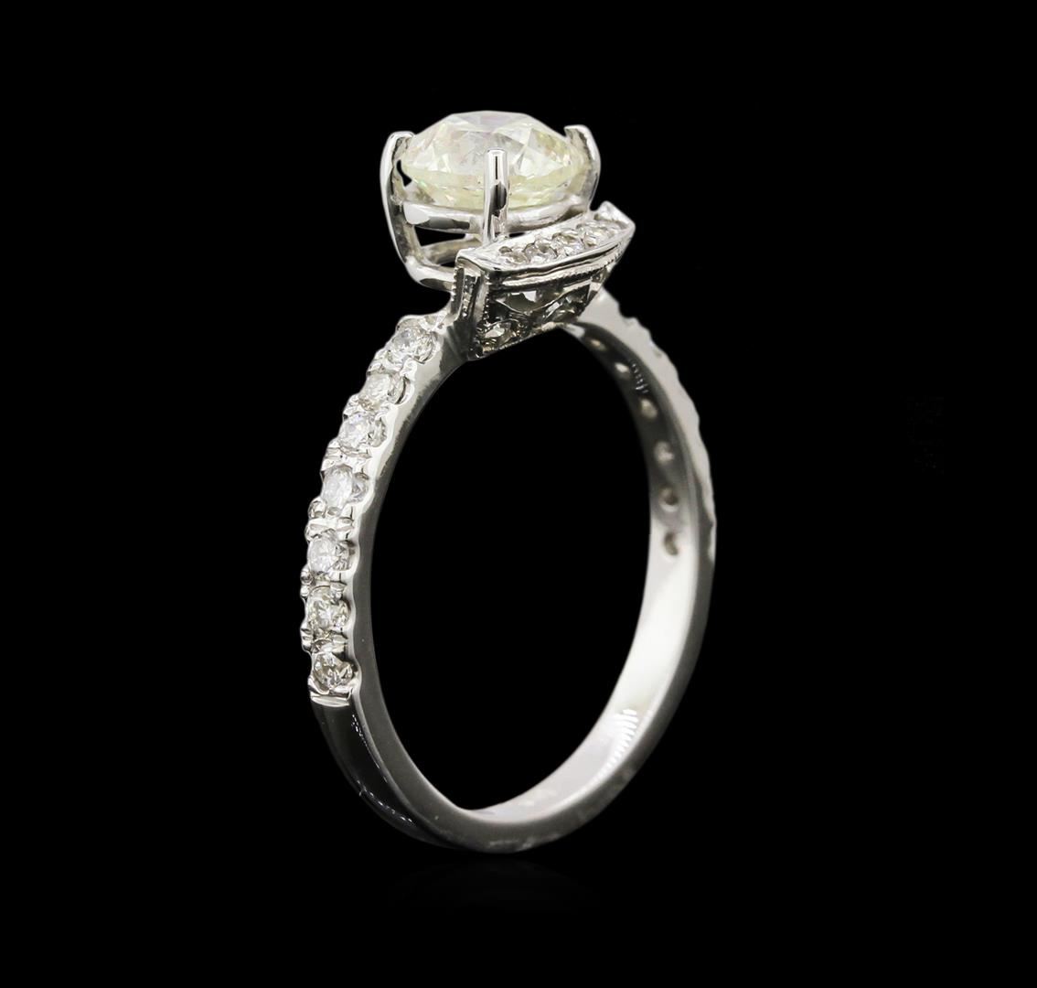 One electronically tested 18KT white gold ladies cast & assembled diamond unity ring. Condition is new, good workmanship. The featured diamond is set within a diamond set half bezel supported by diamond set shoulders, completed by a two millimeter wide band. Identified with markings of "18K". Containing: One prong set round brilliant cut diamond, measuring 6.00 - 5.90 x 4.15mm (depth est.) approximate weight of 1.02ct, fracture filled. Fracture filling has no tolerance to ultrasonic and steam cleaning. Graded in the setting. Clarity: I-3. Color: M. Depth: 69.8%. Table: 57.1%. Nineteen prong set round brilliant cut diamonds, measuring 1.80 - 1.40 x 0.96mm (depth est.) approximate total weight of 19 Stones = 0.30ct. Graded in the setting. Clarity: SI-1 to I-1. Color: H - J. Total Weight of Diamonds: 1.32ct. Total Weight of Ring: 2.64 gm. AIG Appraised at $4,710.00.