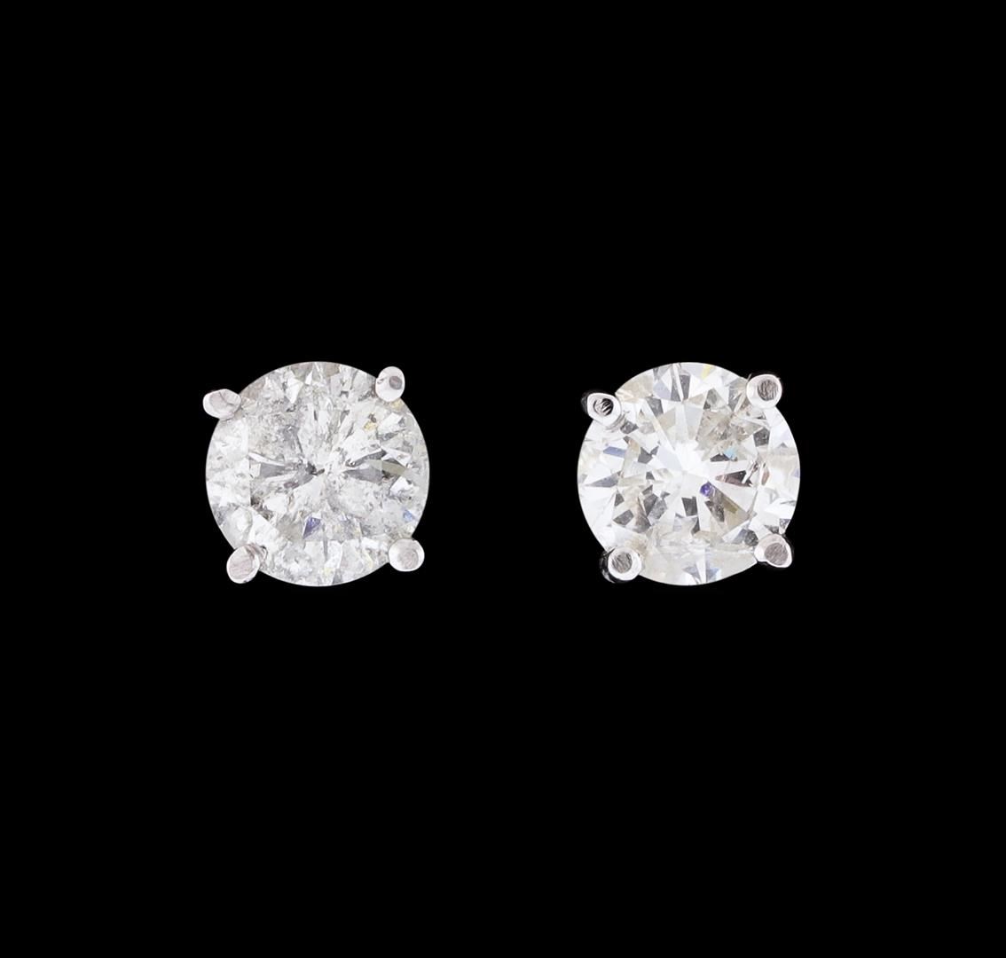 One pair electronically tested 14KT white gold lady's cast stud earrings with friction posts with a basket setting with a bright polish finish. Identified with markings of '14K'. Condition is new, good workmanship. Containing: One prong set round brilliant cut diamond, measuring 5.47 - 5.45 x 3.45mm (depth est.) approximate weight of 0.66ct. Graded in the setting. Clarity I-1. Color: H - I Cut Good One prong set round brilliant cut diamond, measuring 5.48 - 5.47 x 3.50mm (depth est.) approximate weight of 0.67ct. Graded in the setting. Clarity I-2. Color: I Cut Good. Total Weight of Diamonds 1.33ct.. Total Weight of Earrings 1.30gm. GAS Appraised at $5,590.00.