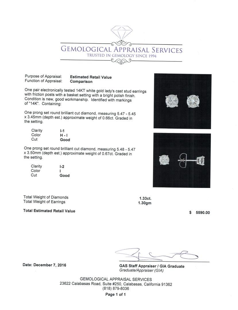 One pair electronically tested 14KT white gold lady's cast stud earrings with friction posts with a basket setting with a bright polish finish. Identified with markings of '14K'. Condition is new, good workmanship. Containing: One prong set round brilliant cut diamond, measuring 5.47 - 5.45 x 3.45mm (depth est.) approximate weight of 0.66ct. Graded in the setting. Clarity I-1. Color: H - I Cut Good One prong set round brilliant cut diamond, measuring 5.48 - 5.47 x 3.50mm (depth est.) approximate weight of 0.67ct. Graded in the setting. Clarity I-2. Color: I Cut Good. Total Weight of Diamonds 1.33ct.. Total Weight of Earrings 1.30gm. GAS Appraised at $5,590.00.