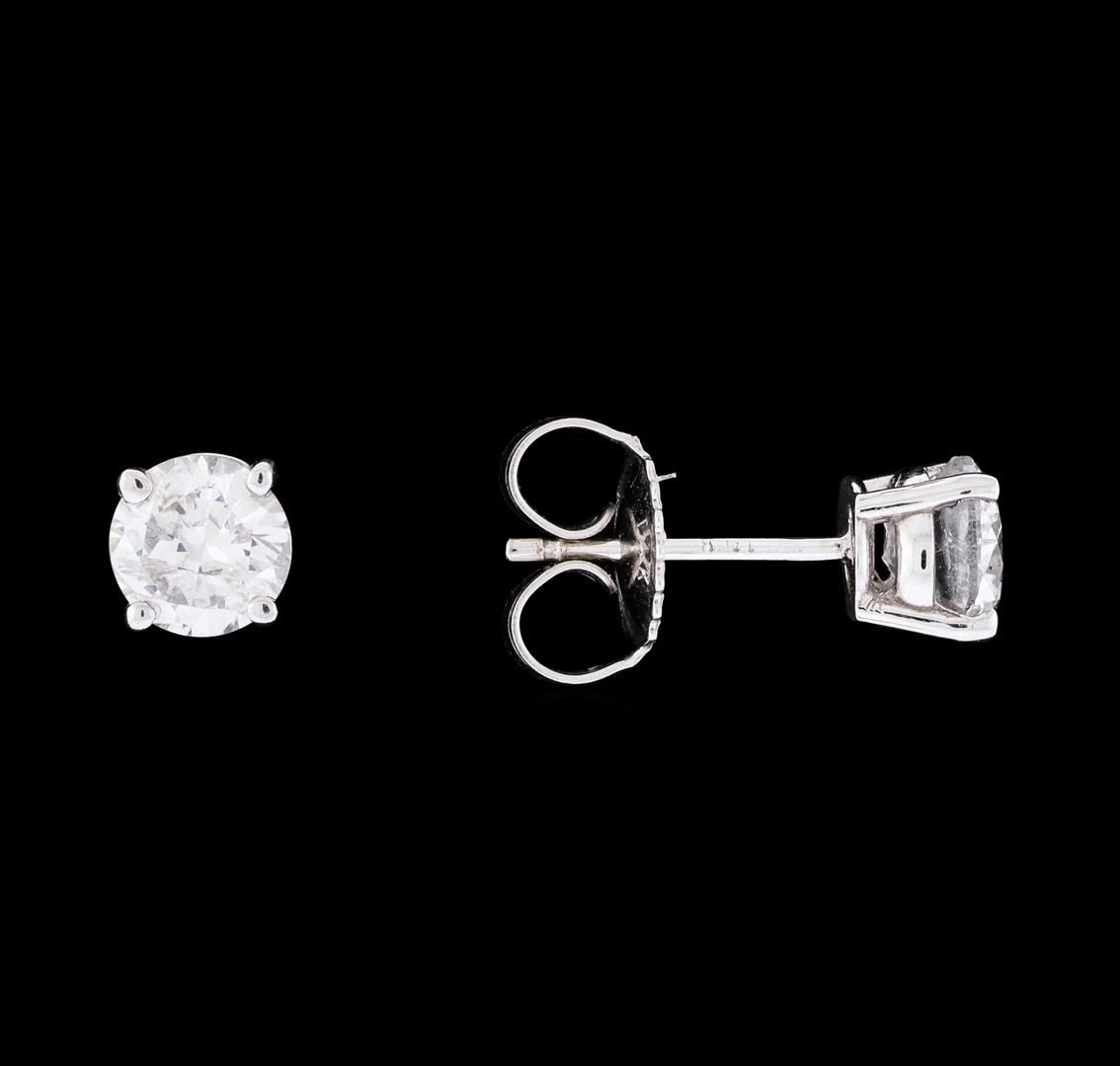 One pair electronically tested 14KT white gold lady's cast stud earrings with friction posts with a basket setting with a bright polish finish. Identified with markings of '14K'. Condition is new, good workmanship. Containing: One prong set round brilliant cut diamond, measuring 5.60 - 5.56 x 3.40mm (depth est.) approximate weight of 0.68ct. Graded in the setting. Clarity I-2. Color: G - H Cut Good One prong set round brilliant cut diamond, measuring 5.45 - 5.40 x 3.60mm (depth est.) approximate weight of 0.65ct. Graded in the setting. Clarity I-1 to I-2. Color: H - I Cut Good. Total Weight of Diamonds 1.33ct.. Total Weight of Earrings 1.30gm. GAS Appraised at $5,830.00.