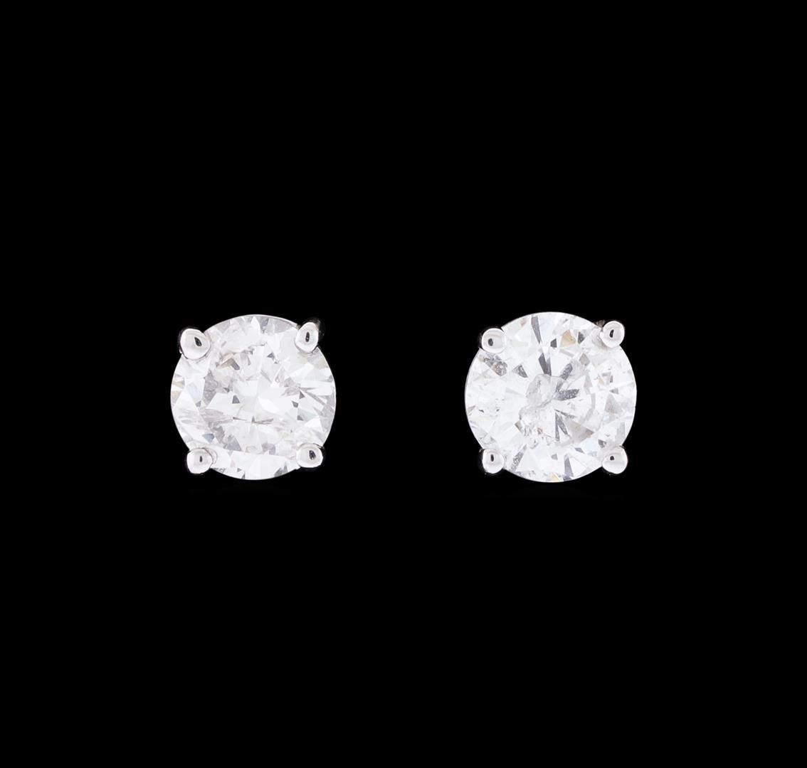 One pair electronically tested 14KT white gold lady's cast stud earrings with friction posts with a basket setting with a bright polish finish. Identified with markings of '14K'. Condition is new, good workmanship. Containing: One prong set round brilliant cut diamond, measuring 5.60 - 5.56 x 3.40mm (depth est.) approximate weight of 0.68ct. Graded in the setting. Clarity I-2. Color: G - H Cut Good One prong set round brilliant cut diamond, measuring 5.45 - 5.40 x 3.60mm (depth est.) approximate weight of 0.65ct. Graded in the setting. Clarity I-1 to I-2. Color: H - I Cut Good. Total Weight of Diamonds 1.33ct.. Total Weight of Earrings 1.30gm. GAS Appraised at $5,830.00.