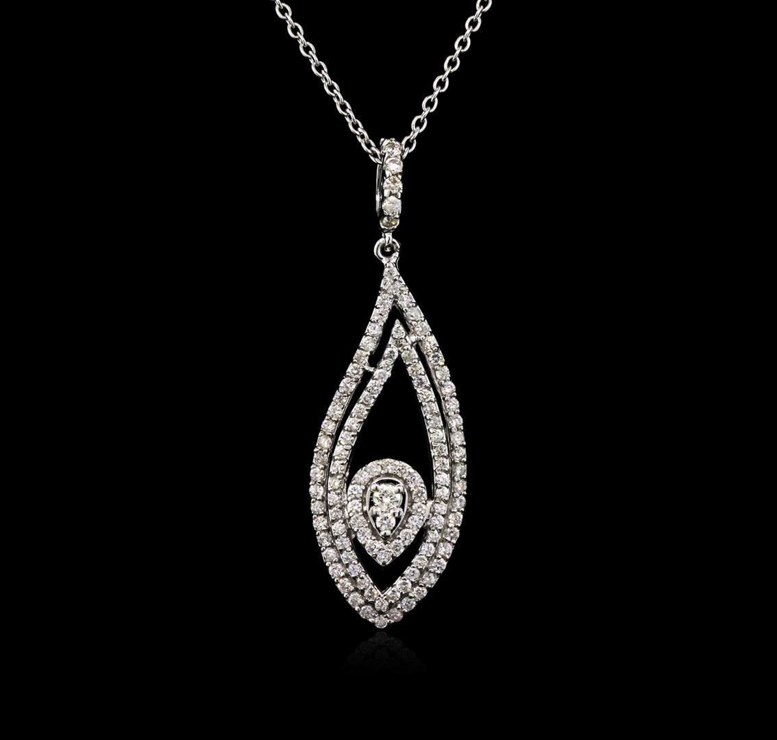 One electronically tested 14KT white gold lady's combination cast & assembled fashion pendant & chain 18.0" long, 1.5mm round cable link with a lobster claw clasp with a bright polish finish. The featured lady's necklace has a double halo marquise motif with an adjustable chain. Identified with markings of "585". Condition is new, good workmanship. Containing: One Hundred Eleven prong set round brilliant cut diamonds, measuring 1.50 - 1.40 x 0.87mm (depth est.) approximate total weight of 111 Stones = 1.27ct. Graded in the setting. Clarity: SI-2 to I-1. Color: H - I. Cut Good One prong set round brilliant cut diamond, measuring 2.50 - 2.40 x 1.59mm (depth est.) approximate weight of 0.06ct. Graded in the setting. Clarity: SI-2. Color: I. Cut Good. Total Weight of Diamonds 1.33ct. Total Weight of Pendant & Chain 8.00gm. GAS Appraised.