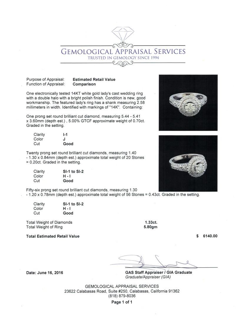 One electronically tested 14KT white gold lady's cast wedding ring with a double halo with a bright polish finish. The featured lady's ring has a shank measuring 2.58 millimeters in width. Identified with markings of "14K". Condition is new, good workmanship. Containing: One prong set round brilliant cut diamond, measuring 5.44 - 5.41 x 3.60mm (depth est.) , 5.00.%. GTCF approximate weight of 0.70ct. Graded in the setting. Clarity: I-1. Color: Good Twenty prong set round brilliant cut diamonds, measuring 1.40 - 1.30 x 0.84mm (depth est.) approximate total weight of 20 Stones = 0.20ct. Graded in the setting. Clarity: SI-1 to SI-2. Color: H - I. Cut Good Fifty-Six prong set round brilliant cut diamonds, measuring 1.30 - 1.20 x 0.78mm (depth est.) approximate total weight of 56 Stones = 0.43ct. Graded in the setting. Clarity: SI-1 to SI-2. Color: H - I. Cut Good. Total Weight of Diamonds 1.33ct. Total Weight of Ring 5.80gm GAS Appraised at $6,140.00.