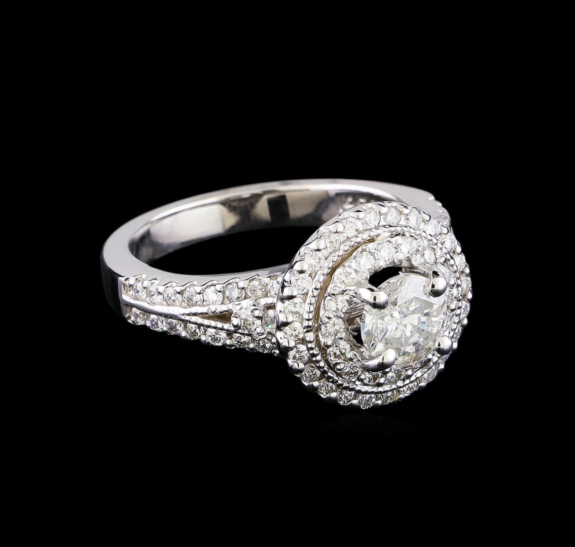 One electronically tested 14KT white gold lady's cast wedding ring with a double halo with a bright polish finish. The featured lady's ring has a shank measuring 2.58 millimeters in width. Identified with markings of "14K". Condition is new, good workmanship. Containing: One prong set round brilliant cut diamond, measuring 5.44 - 5.41 x 3.60mm (depth est.) , 5.00.%. GTCF approximate weight of 0.70ct. Graded in the setting. Clarity: I-1. Color: Good Twenty prong set round brilliant cut diamonds, measuring 1.40 - 1.30 x 0.84mm (depth est.) approximate total weight of 20 Stones = 0.20ct. Graded in the setting. Clarity: SI-1 to SI-2. Color: H - I. Cut Good Fifty-Six prong set round brilliant cut diamonds, measuring 1.30 - 1.20 x 0.78mm (depth est.) approximate total weight of 56 Stones = 0.43ct. Graded in the setting. Clarity: SI-1 to SI-2. Color: H - I. Cut Good. Total Weight of Diamonds 1.33ct. Total Weight of Ring 5.80gm GAS Appraised at $6,140.00.