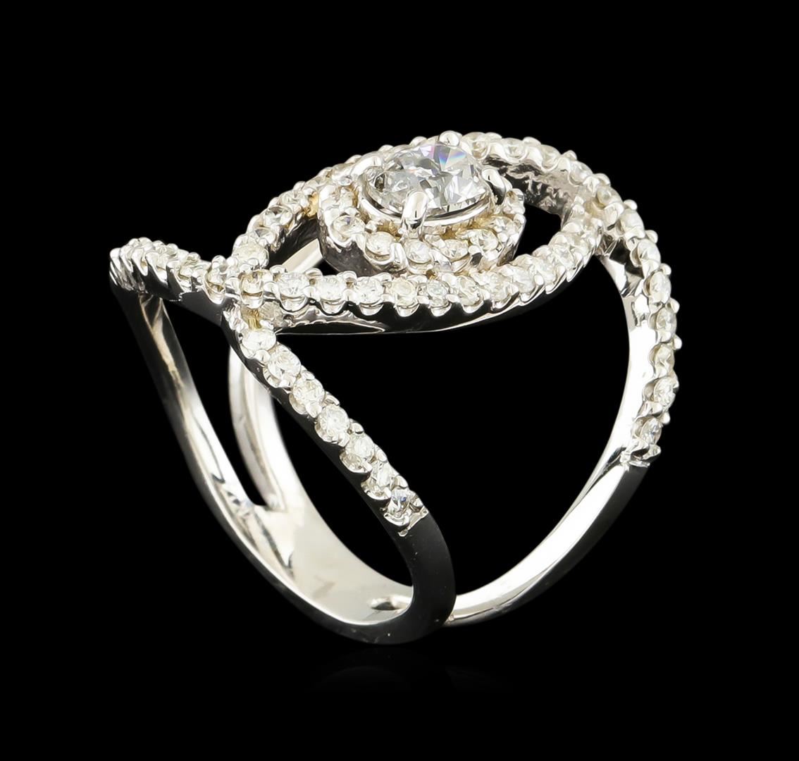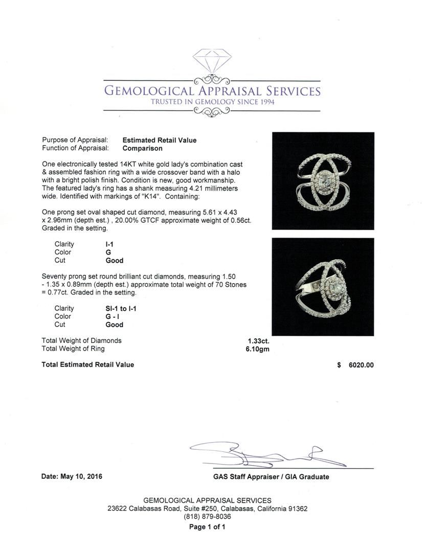One electronically tested 14KT white gold lady's combination cast & assembled fashion ring with a wide crossover band with a halo with a bright polish finish. The featured lady's ring has a shank measuring 4.21 millimeters wide. Identified with markings of "K14". Condition is new, good workmanship. Containing: One prong set oval shaped cut diamond, measuring 5.61 x 4.43 x 2.96mm (depth est.) , 20.00.%. GTCF approximate weight of 0.56ct. Graded in the setting. Clarity: I-1. Color: G. Cut Good Seventy prong set round brilliant cut diamonds, measuring 1.50 - 1.35 x 0.89mm (depth est.) approximate total weight of 70 Stones = 0.77ct. Graded in the setting. Clarity: SI-1 to I-1. Color: G - I. Cut Good. Total Weight of Diamonds 1.33ct. Total Weight of Ring 6.10gm. GAS Appraised at $6,020.00.
