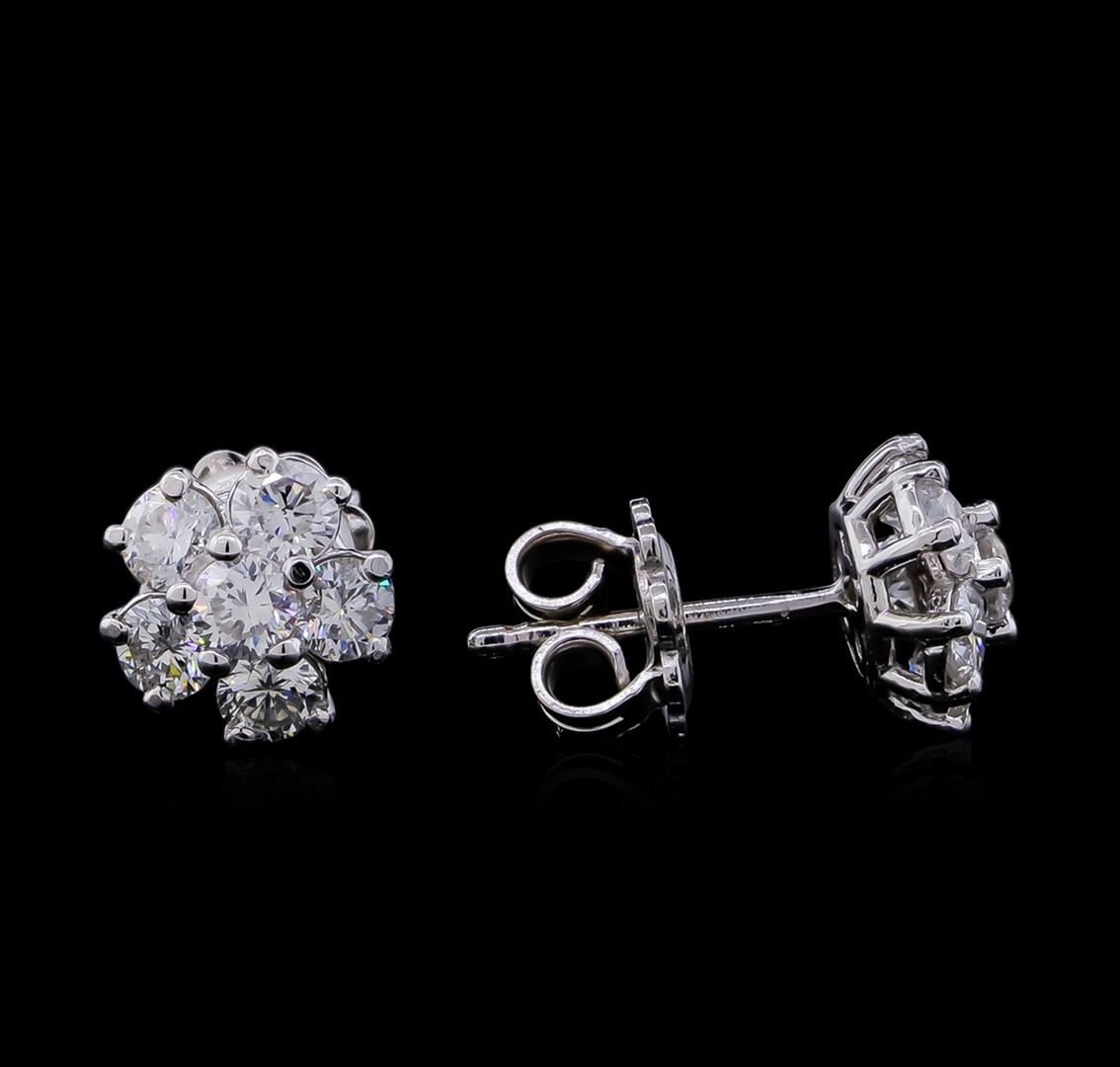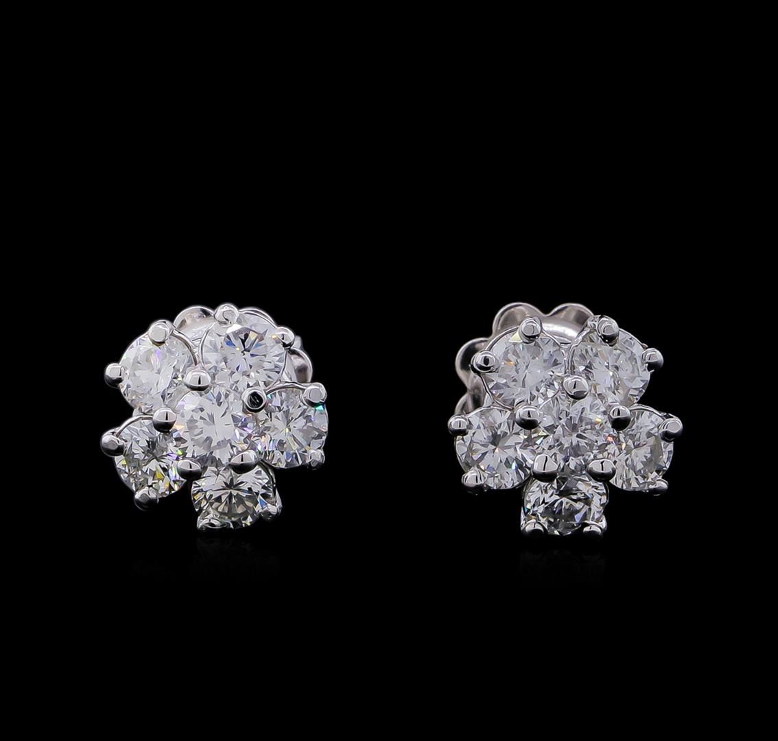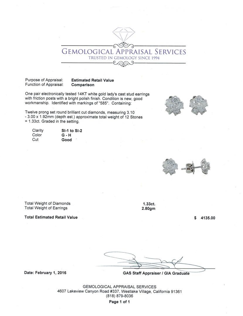 One pair electronically tested 14KT white gold lady's cast stud earrings with friction posts with a bright polish finish. Identified with markings of "585". Condition is new, good workmanship. Containing: Twelve prong set round brilliant cut diamonds, measuring 3.10 - 3.00 x 1.92mm (depth est.) approximate total weight of 12 Stones = 1.33ct. Graded in the setting. Clarity: SI-1 to SI-2. Color: G - H. Cut Good. Total Weight of Diamonds 1.33ct. Total Weight of Earrings 2.80gm. GAS Appraised at $4,135.00.