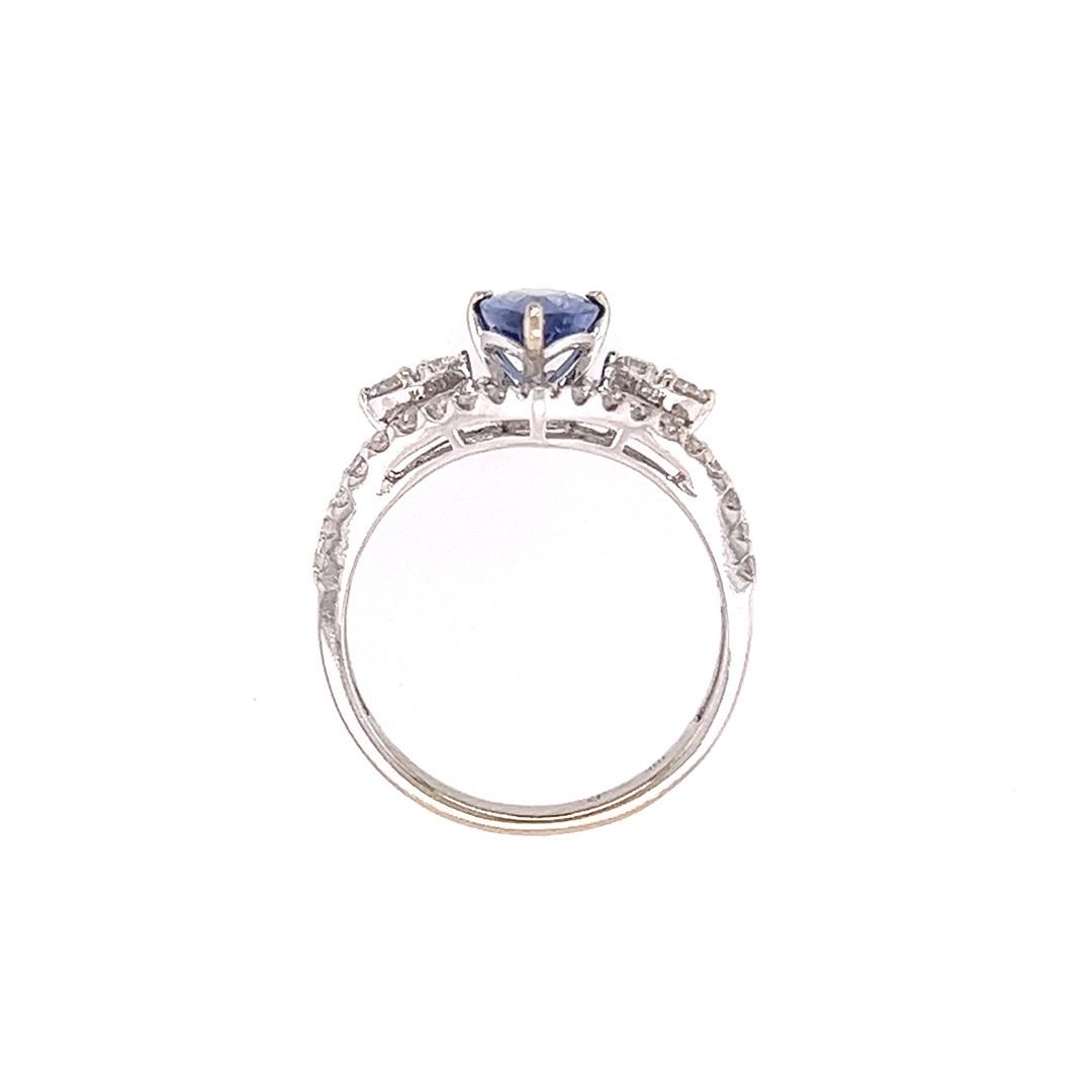 One electronically tested 18KT white gold lady's combination cast & assembled custom fashion ring with a chevron motif with a bright polish finish. Condition is new, good workmanship. The featured lady's ring has a shank measuring 2.40 millimeters in width. Identified with markings of "18K". Containing: One prong set pear modified brilliant cut natural blue sapphire, measuring 9.65 x 5.55 x 3.20mm, (depth est.) approximate weight of 1.33ct., clarity is eye clean, medium light, very slightly grayish, blue color, (GIA B 4/3), cut is very good. Transmitting light with no distortion, transparent. Colored gemstones are presumed to have been subjected to commonly used enhancement processes. Graded in the setting. Two prong set round brilliant cut diamonds, measuring 2.55 - 2.50 x 1.57mm (depth est.) approximate total weight of 2 Stones = 0.12ct. Clarity of SI-1 to SI-2, color of G - H, cut is very good. Graded in the setting. Two prong set round brilliant cut diamonds, measuring 2.30 - 2.25 x 1.41mm (depth est.) approximate total weight of 2 Stones = 0.09ct. Clarity of VS-2 to SI-1, color of G - H, cut is very good. Graded in the setting. Appraisal No: 000022197000 Thirty-eight prong set round brilliant cut diamonds, measuring 1.60 - 1.50 x 0.96mm (depth est.) approximate total weight of 38 Stones = 0.54ct. Clarity of VS-2 to SI-1, color of G - H, cut is very good. Graded in the setting. Total Weight of Colored Stones Total Weight of Diamonds Total Weight of Ring 1.33ct. 0.75ct. 3.80gm Total Estimated Retail Value $ 5290.00