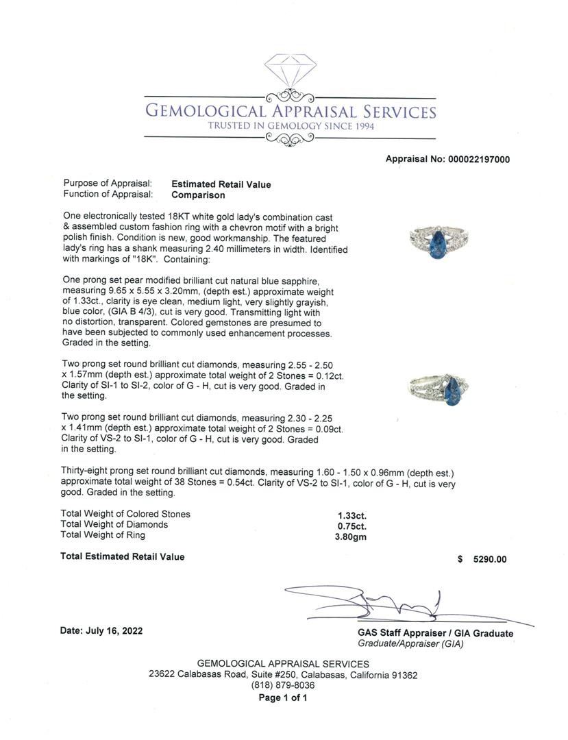 One electronically tested 18KT white gold lady's combination cast & assembled custom fashion ring with a chevron motif with a bright polish finish. Condition is new, good workmanship. The featured lady's ring has a shank measuring 2.40 millimeters in width. Identified with markings of "18K". Containing: One prong set pear modified brilliant cut natural blue sapphire, measuring 9.65 x 5.55 x 3.20mm, (depth est.) approximate weight of 1.33ct., clarity is eye clean, medium light, very slightly grayish, blue color, (GIA B 4/3), cut is very good. Transmitting light with no distortion, transparent. Colored gemstones are presumed to have been subjected to commonly used enhancement processes. Graded in the setting. Two prong set round brilliant cut diamonds, measuring 2.55 - 2.50 x 1.57mm (depth est.) approximate total weight of 2 Stones = 0.12ct. Clarity of SI-1 to SI-2, color of G - H, cut is very good. Graded in the setting. Two prong set round brilliant cut diamonds, measuring 2.30 - 2.25 x 1.41mm (depth est.) approximate total weight of 2 Stones = 0.09ct. Clarity of VS-2 to SI-1, color of G - H, cut is very good. Graded in the setting. Appraisal No: 000022197000 Thirty-eight prong set round brilliant cut diamonds, measuring 1.60 - 1.50 x 0.96mm (depth est.) approximate total weight of 38 Stones = 0.54ct. Clarity of VS-2 to SI-1, color of G - H, cut is very good. Graded in the setting. Total Weight of Colored Stones Total Weight of Diamonds Total Weight of Ring 1.33ct. 0.75ct. 3.80gm Total Estimated Retail Value $ 5290.00