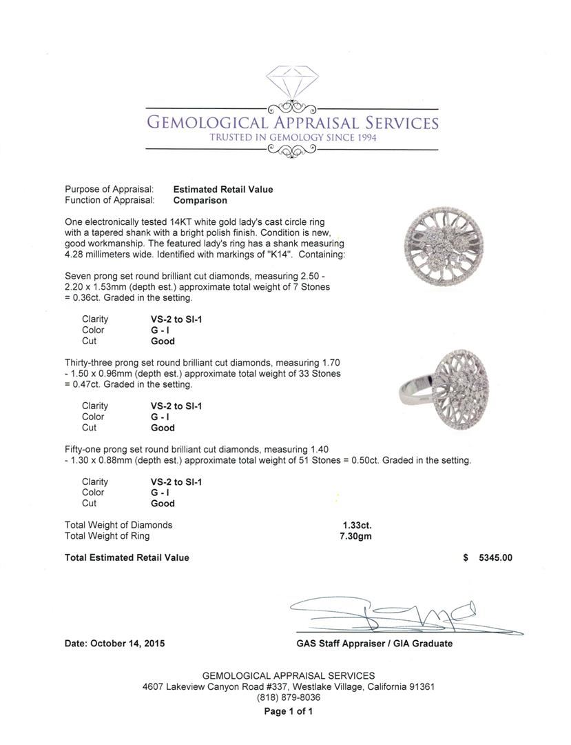 One electronically tested 14KT white gold lady's cast circle ring with a tapered shank with a bright polish finish. The featured lady's ring has a shank measuring 4.28 millimeters wide. Identified with markings of "K14". Condition is new, good workmanship. Containing: Seven prong set round brilliant cut diamonds, measuring 2.50 - 2.20 x 1.53mm (depth est.) approximate total weight of 7 Stones = 0.36ct. Graded in the setting. Clarity: VS-2 to SI-1. Color: G - I. Cut Good Thirty-Three prong set round brilliant cut diamonds, measuring 1.70 - 1.50 x 0.96mm (depth est.) approximate total weight of 33 Stones = 0.47ct. Graded in the setting. Clarity: VS-2 to SI-1. Color: G - I. Cut Good Fifty-One prong set round brilliant cut diamonds, measuring 1.40 - 1.30 x 0.88mm (depth est.) approximate total weight of 51 Stones = 0.50ct. Graded in the setting. Clarity: VS-2 to SI-1. Color: G - I. Cut Good. Total Weight of Diamonds 1.33ct. Total Weight of Ring 7.30gm. GAS Appraised at $5,345.00.