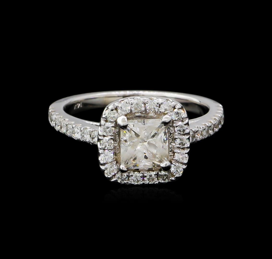 One electronically tested 14KT white gold ladies cast diamond unity ring with a bright polish finish. The featured diamond is set within a diamond bezel supported by diamond set shoulders, completed by a one and one-half millimeter wide band. Identified with markings of "14K". Condition is new, good workmanship. Containing: One prong set princess rectangular cut diamond, measuring 5.40 x 5.10 x 3.50mm (depth est.) approximate weight of 0.91ct with a strong blue fluorescence. Graded in the setting. Clarity: I-2. Color: 68.6%. Table 74.5%. Thirty-Six prong set round brilliant cut diamonds approximate total weight of 36 Stones = 0.42ct. Graded in the setting. Clarity: SI-2 to I-2. Color: G - I. Total Weight of Diamonds 1.33ct. Total Weight of Ring 3.49gm. AIG Appraised at $5,740.00.