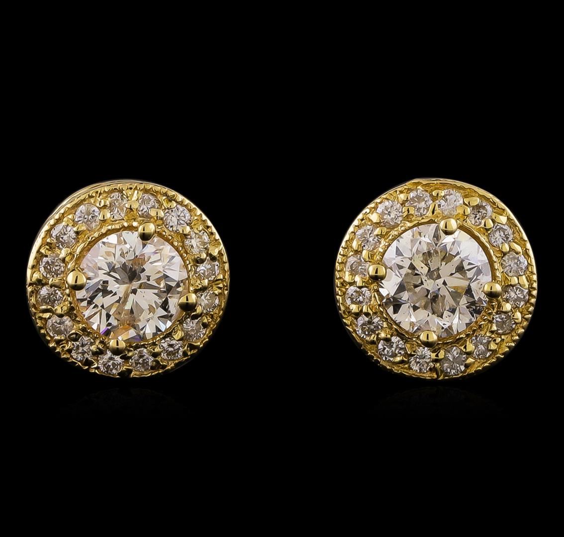 One pair electronically tested 14KT yellow gold lady's combination cast & assembled halo stud earrings with medium friction backs with a bright polish with milgrain detailing finish. Identified with markings of "K14". Condition is new, good workmanship. Containing: Two prong set round brilliant cut diamonds, measuring 5.09 - 5.06 x 3.15mm (depth est.) , 5.00.%. GTCF approximate total weight of 2 Stones = 1.08ct. Graded in the setting. Clarity: SI-2. Color: I - Good Thirty-Two prong set round brilliant cut diamonds, measuring 1.35 - 1.25 x 0.79mm (depth est.) approximate total weight of 32 Stones = 0.26ct. Graded in the setting. Clarity: SI-1 to SI-2. Color: G - Good. Total Weight of Diamonds 1.34ct. Total Weight of Earrings 2.80gm. GAS Appraised at $7,125.00.