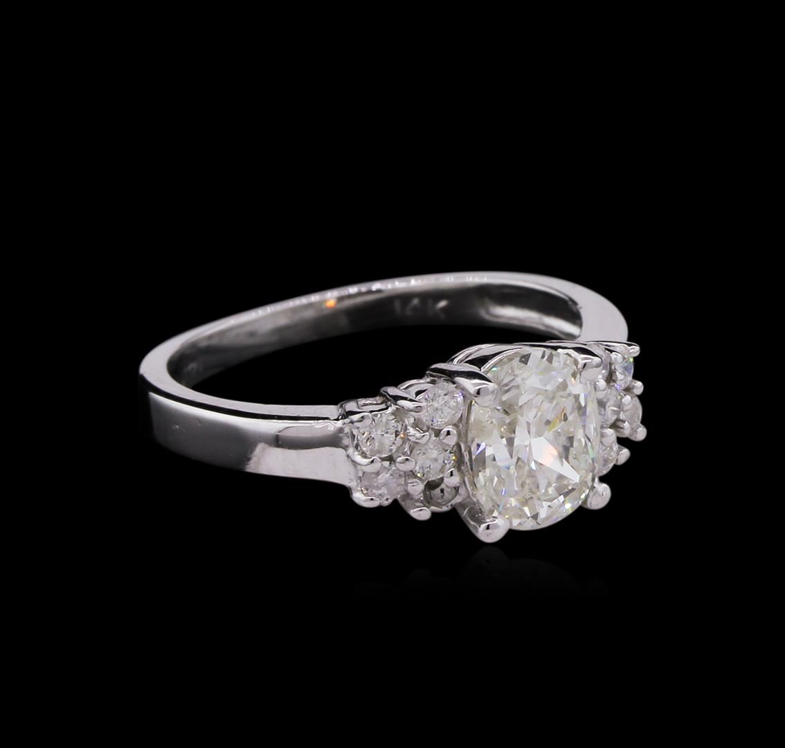 One electronically tested 14KT white gold lady's cast wedding ring with a basket wire mounting with a bright polish finish. The featured lady's ring has a shank measuring 1.92 millimeters wide. Identified with markings of "14K". Condition is new, good workmanship. Containing: One prong set oval shaped cut diamond, measuring 7.00 x 5.83 x 3.66mm (depth est.) , 10.00.%. GTCF approximate weight of 1.09ct. Graded in the setting. Clarity: I-1. Color: Good Ten prong set round brilliant cut diamonds, measuring 1.90 - 1.80 x 1.17mm (depth est.) approximate total weight of 10 Stones = 0.25ct. Graded in the setting. Clarity: SI-1 to I-1. Color: H - I. Cut Good. Total Weight of Diamonds 1.34ct. Total Weight of Ring 2.90gm. GAS Appraised at $7,385.00. GAS Appraised at $7,385.00.