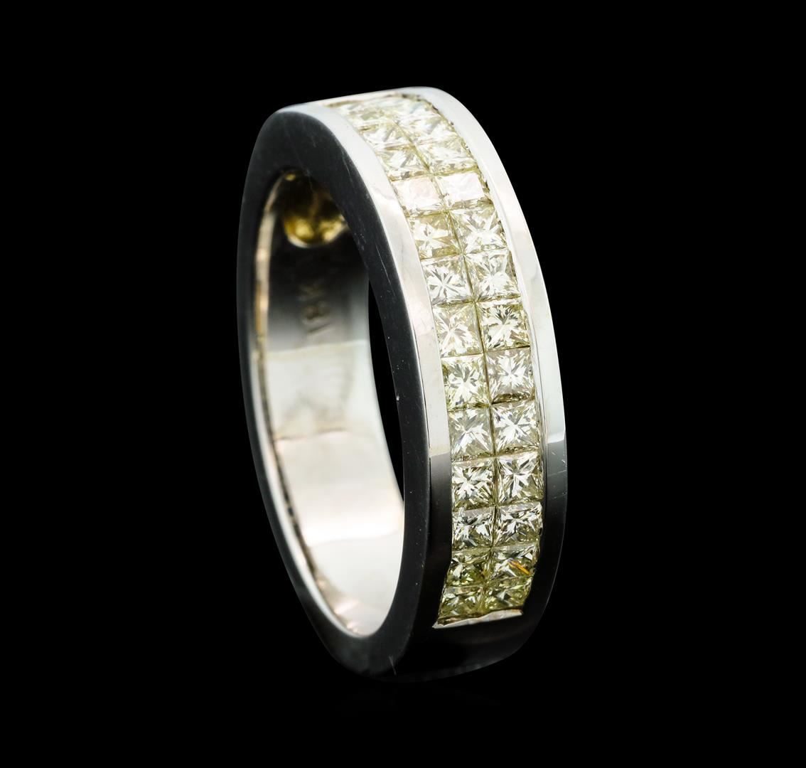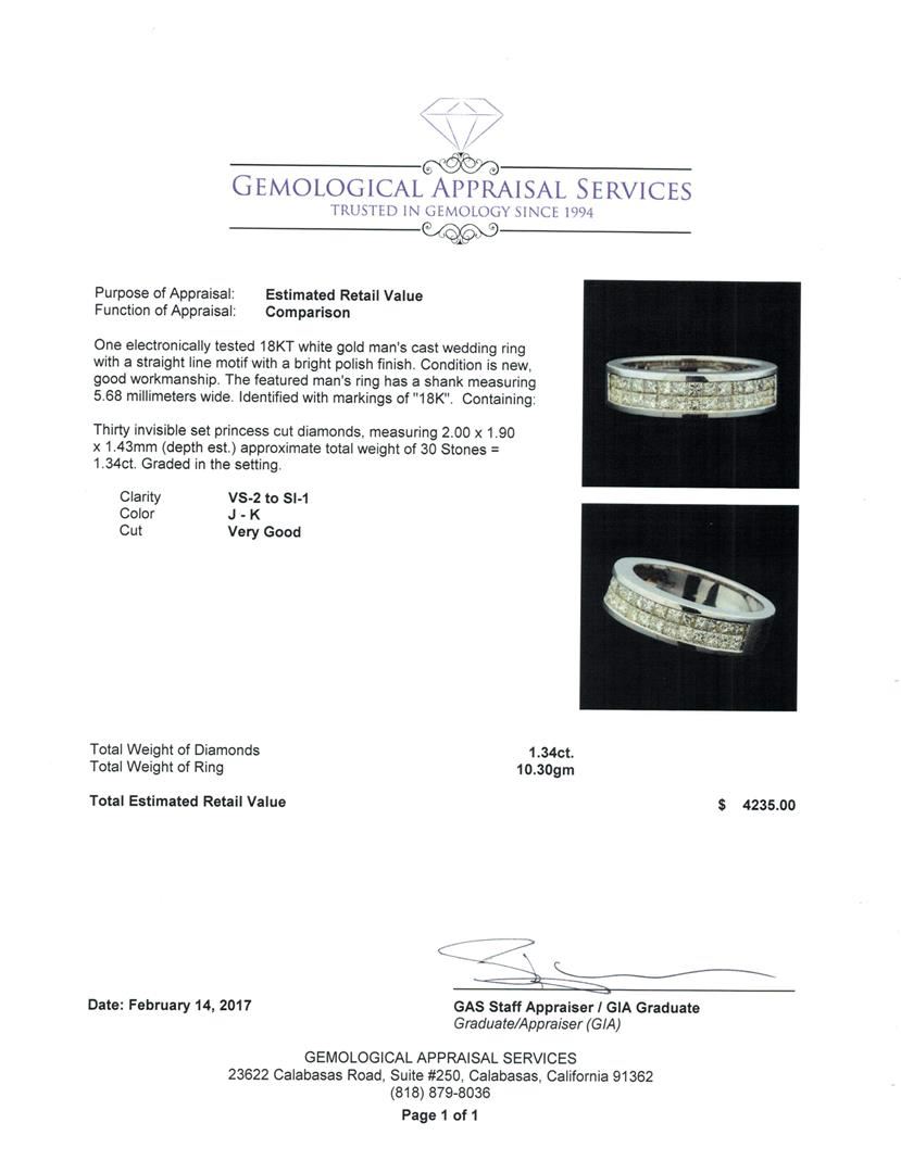 One electronically tested 18KT white gold man's cast wedding ring with a straight line motif with a bright polish finish. The featured man's ring has a shank measuring 5.68 millimeters wide. Identified with markings of '18K'. Condition is new, good workmanship. Containing: Thirty invisible set princess cut diamonds, measuring 2.00 x 1.90 x 1.43mm (depth est.) approximate total weight of 30 Stones = 1.34ct. Graded in the setting. Clarity VS-2 to SI-1. Color: J - K Cut Very Good. Total Weight of Diamonds 1.34ct.. Total Weight of Ring 10.30gm. GAS Appraised at $4,235.00.
