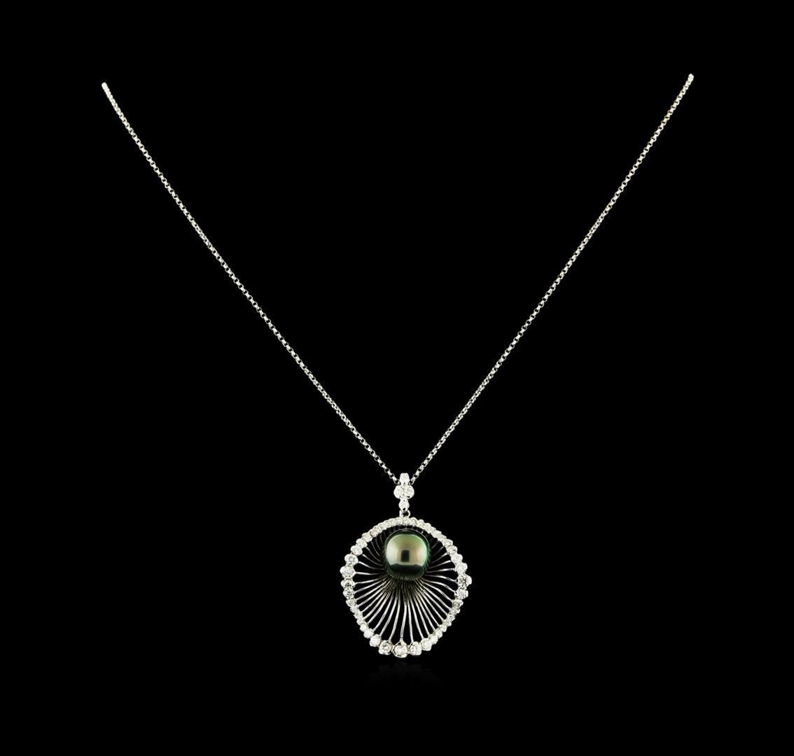 One electronically tested 14KT white gold lady's combination cast & assembled fashion pendant & chain 18.0" long, 1.2mm diamond cut rolo chain with a lobster claw clasp with a bright polish finish. Identified with markings of "14K". Condition is new, good workmanship. Containing: One Tahitian pearl, 10.8mm in size to 10.8mm in size. The pearl is black in color, green overtone with a very good luster, round, and clean. Graded in the setting. Fifteen prong set round brilliant cut diamonds, measuring 2.50 - 2.10 x 1.38mm (depth est.) approximate total weight of 15 Stones = 0.66ct. Graded in the setting. Clarity: SI-1 to SI-2. Color: H - I. Cut Good Thirty-Eight prong set round brilliant cut diamonds, measuring 1.90 - 1.40 x 1.02mm (depth est.) approximate total weight of 38 Stones = 0.68ct. Graded in the setting. Clarity: SI-1 to SI-2. Color: H - I. Cut Good. Total Weight of Diamonds 1.34ct. Total Weight of Pendant & Chain 8.00gm. GAS Appraised.