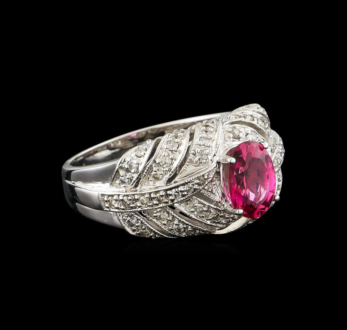 One electronically tested 10KT white gold ladies cast pink tourmaline and diamond ring. The featured pink tourmaline is set within an elaborate diamond set botanical gallery, completed by a two and one-half millimeter wide band. Bright polish finish with milgrain detailing throughout. Trademark is RI. Identified with markings of "10K". Condition is new, good workmanship. Containing: One prong set oval mixed cut natural pink tourmaline, measuring 7.95 x 5.90 x 4.10mm, approximate weight of 1.34ct., clarity is eye clean, type II, medium, very slightly brownish, slightly purplish red color, (GIA slpR 5/3), cut is good. Transmitting light with no distortion, transparent. Graded in the setting. This color of tourmaline is commonly irradiated to improve or change the color. Whether or not this gemstone has been irradiated cannot currently be determined. Fifty-Six prong set round brilliant cut diamonds, measuring 1.20 - 1.10 x 0.69mm (depth est.) approximate total weight of 56 Stones = 0.38ct. Graded in the setting. Clarity: I-1 to I-2. Color: H - J. Total Weight of Colored Stones 1.34ct. Total Weight of Diamonds 0.38ct. Total Weight of Ring 4.95gm. AIG Appraised at $2,130.00.