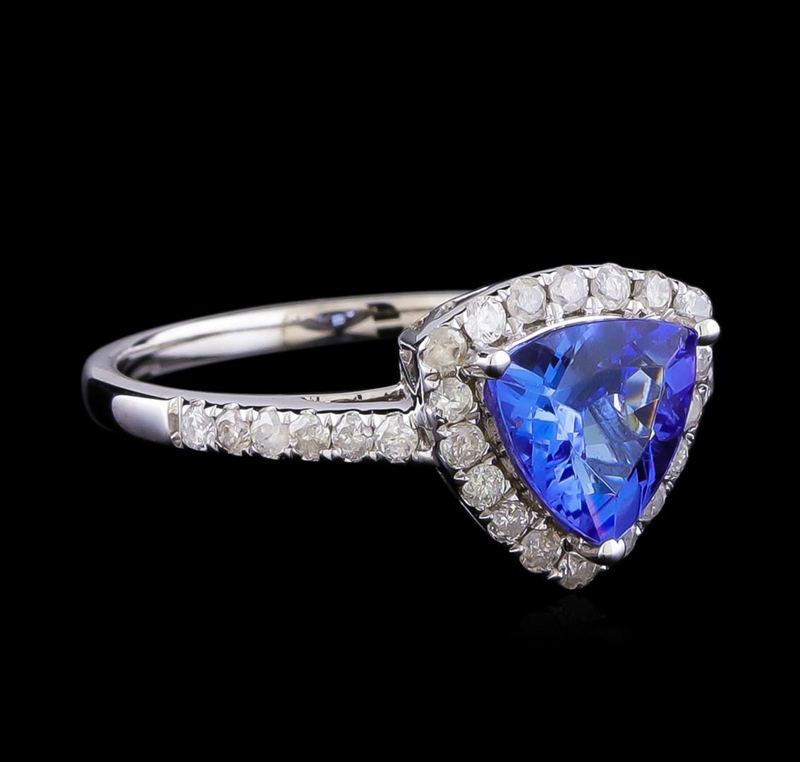 One electronically tested 14KT white gold ladies cast tanzanite and diamond ring with a bright polish finish. The featured tanzanite is set within a diamond bezel supported by diamond set shoulders, completed by a one and one-half millimeter wide band. Trademark is Orianne. Identified with markings of "14K". Condition is new, good workmanship. Containing: One prong set triangle mixed cut natural tanzanite approximate weight of 1.34ct., clarity is slightly included, type I, medium, very slightly grayish, violetish blue color, (GIA vB 5/3), cut is good. Transmitting light with a minimum of distortion, transparent. Naturally occurring internal & external characteristics are present. Graded in the setting. Tanzanite is a very rare gemstone that is only found in the country of Tanzania. Originally discovered in 1967. Tiffany & Company, named the stone Tanzanite. It is found in the Usumburu Mountains that border the Umba Valley of northern Tanzania. Tanzanite occurs in gray, brown, violet, blue, reddish-purple, & green. The gem is interesting because of its exceptional pleochroism. Rotated in different directions a tanzanite will exhibit multiple changes of color. Tanzanite has a low tolerance to ultrasonic cleaning, and should not be cleaned using this method. Thirty prong set round brilliant cut diamonds approximate total weight of 30 Stones = 0.41ct. Graded in the setting. Clarity: I-2 to I-3. Color: G - I. Total Weight of Colored Stones 1.34ct. Total Weight of Diamonds 0.41ct. Total Weight of Ring 2.70gm. AIG Appraised at $3,440.00.