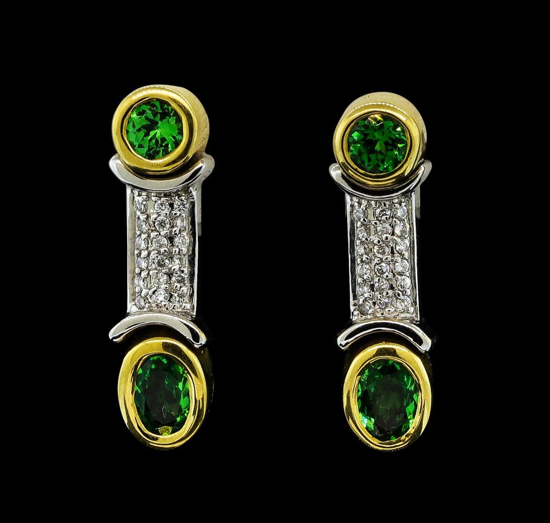 One pair electronically tested 18KT yellow & white gold ladies cast & assembled tsavorite garnet and diamond dangle earrings with standard backs. Each earring features two tsavorite garnets set within yellow gold bezels connected by a vertical diamond gallery set within a white gold ribbon. Bright polish finish. Identified with markings of '18K 750'. Condition is good. Containing: Four bezel set oval and round mixed cut natural tsavorite garnets approximate total weight of 1.34ct., clarity is eye clean, type II, medium, very slightly grayish, yellowish green color, (GIA yG 5/3), cut is good. Transmitting light with no distortion, transparent. Color grade is an average for the group. Graded in the setting. Thirty-Six prong set round brilliant cut diamonds, measuring 1.00 - 1.00 x 0.60mm (depth est.) approximate total weight of 36 Stones = 0.16ct. Graded in the setting. Clarity SI-1 to I-1. Color: F - H. Total Weight of Colored Stones 1.34ct.. Total Weight of Diamonds 0.16ct.. Total Weight of Dangle Earrings 7.96gm. AIG Appraised at $3,965.00.