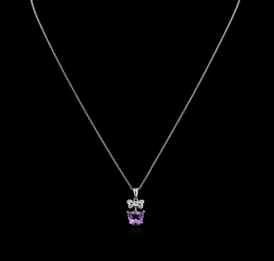 One pendant with chain featuring: 18KT white gold weighing 1.77 grams containing one prong set half moon cut amethyst center stone with a total weight of 1.34ct and five pave/bezel set round diamonds with a total weight of 0.06ct.