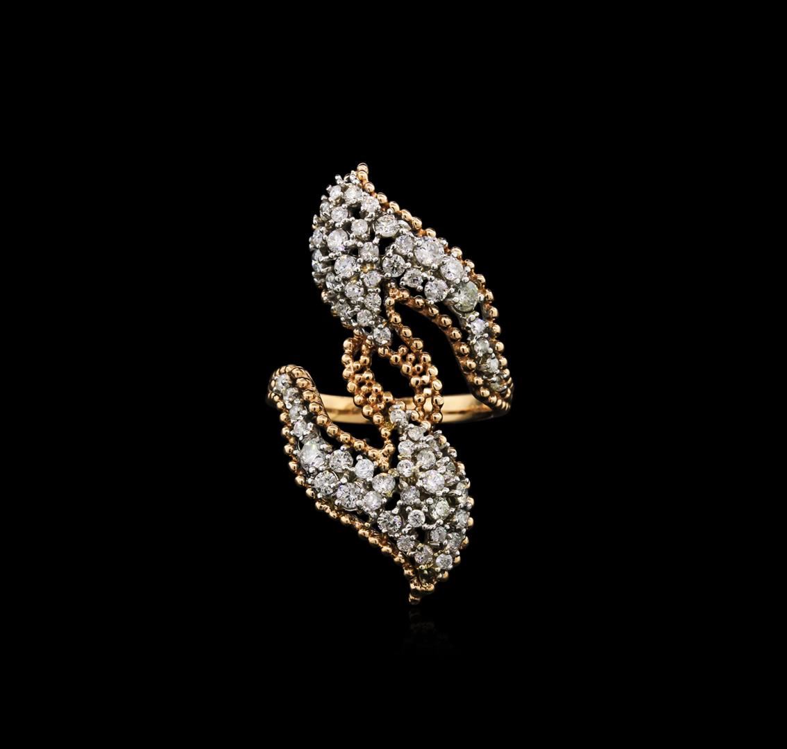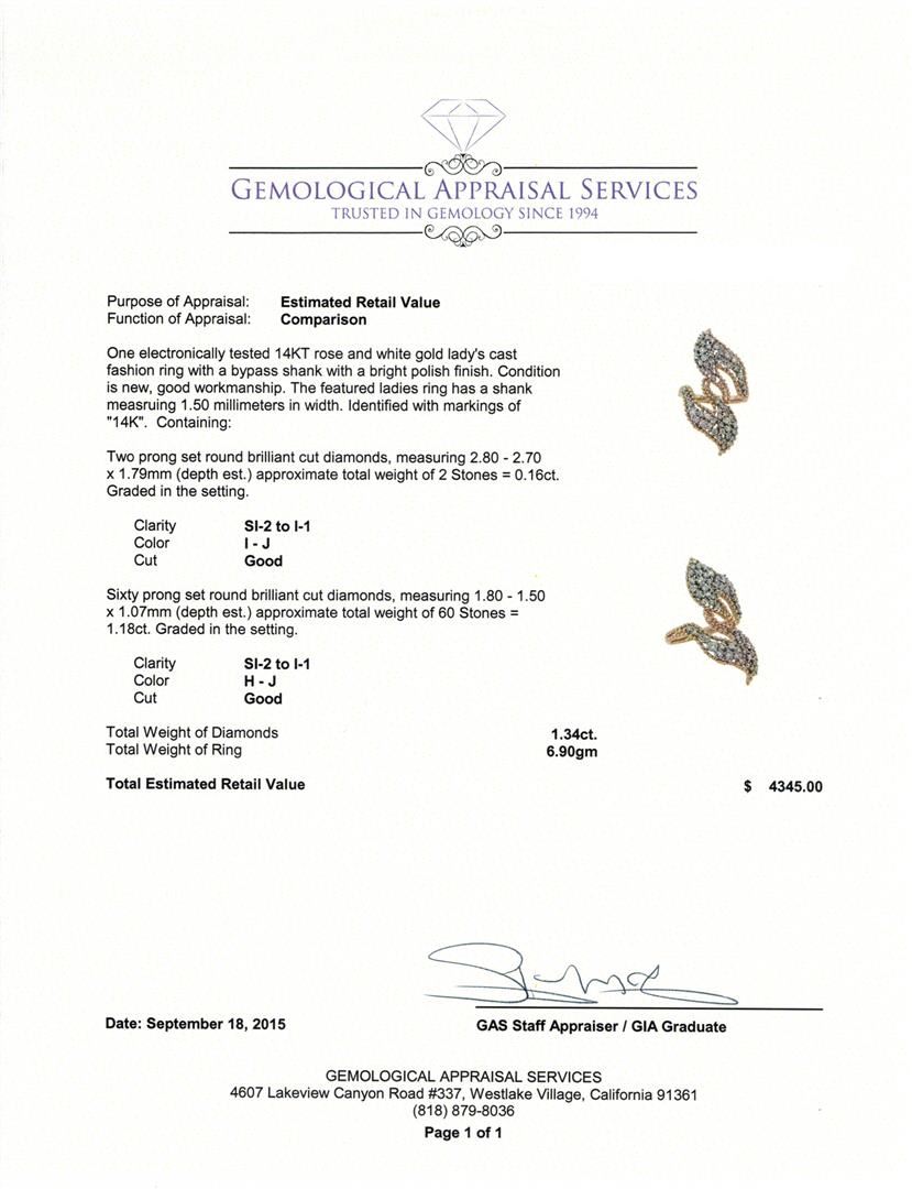One electronically tested 14KT rose and white gold lady's cast fashion ring with a bypass shank with a bright polish finish. The featured ladies ring has a shank measuring 1.50 millimeters in width. Identified with markings of "14K". Condition is new, good workmanship. Containing: Two prong set round brilliant cut diamonds, measuring 2.80 - 2.70 x 1.79mm (depth est.) approximate total weight of 2 Stones = 0.16ct. Graded in the setting. Clarity: SI-2 to I-1. Color: I - Good Sixty prong set round brilliant cut diamonds, measuring 1.80 - 1.50 x 1.07mm (depth est.) approximate total weight of 60 Stones = 1.18ct. Graded in the setting. Clarity: SI-2 to I-1. Color: H - Good. Total Weight of Diamonds 1.34ct. Total Weight of Ring 6.90gm. GAS Appraised at $4,345.00.