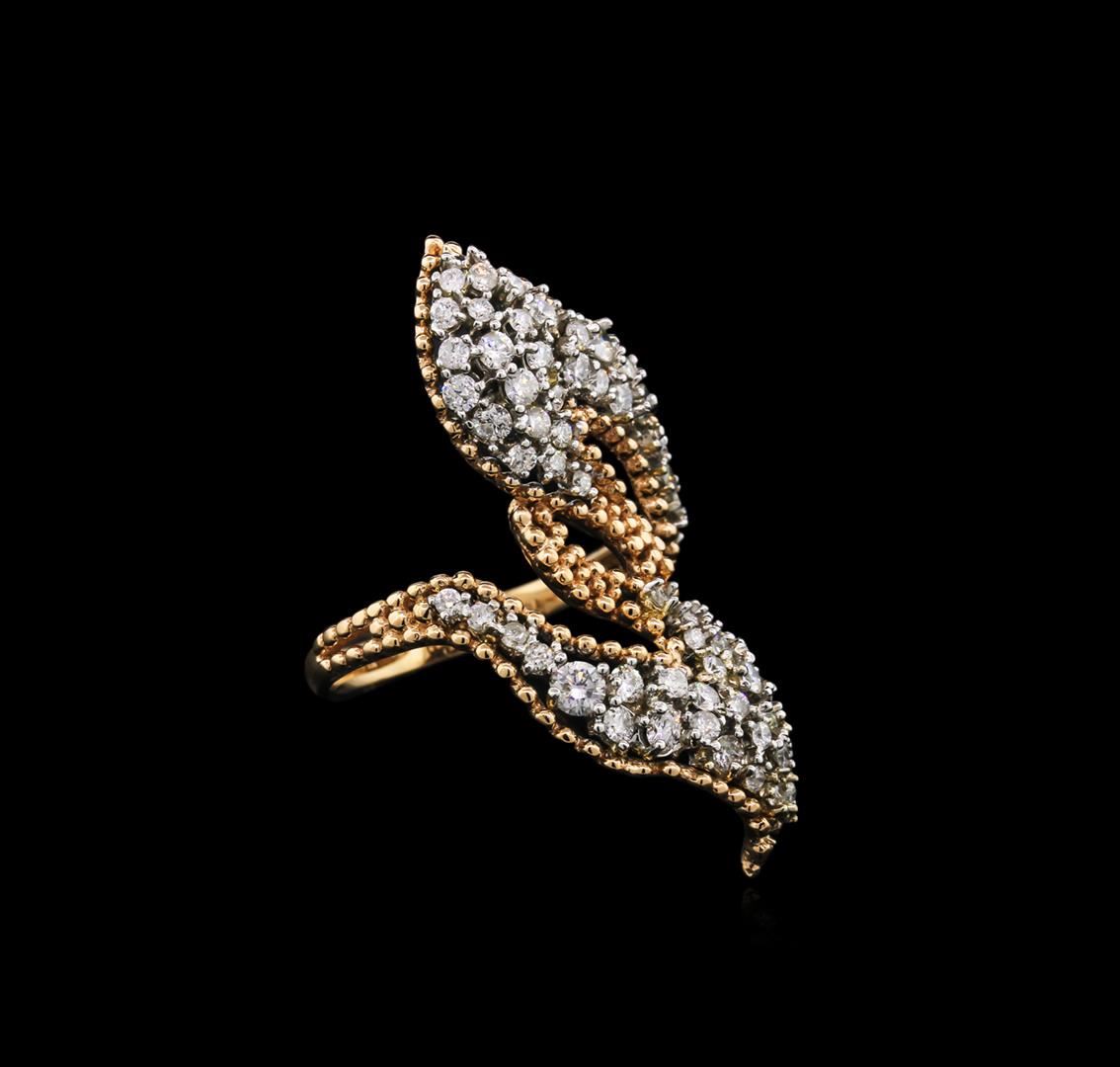 One electronically tested 14KT rose and white gold lady's cast fashion ring with a bypass shank with a bright polish finish. The featured ladies ring has a shank measuring 1.50 millimeters in width. Identified with markings of "14K". Condition is new, good workmanship. Containing: Two prong set round brilliant cut diamonds, measuring 2.80 - 2.70 x 1.79mm (depth est.) approximate total weight of 2 Stones = 0.16ct. Graded in the setting. Clarity: SI-2 to I-1. Color: I - Good Sixty prong set round brilliant cut diamonds, measuring 1.80 - 1.50 x 1.07mm (depth est.) approximate total weight of 60 Stones = 1.18ct. Graded in the setting. Clarity: SI-2 to I-1. Color: H - Good. Total Weight of Diamonds 1.34ct. Total Weight of Ring 6.90gm. GAS Appraised at $4,345.00.