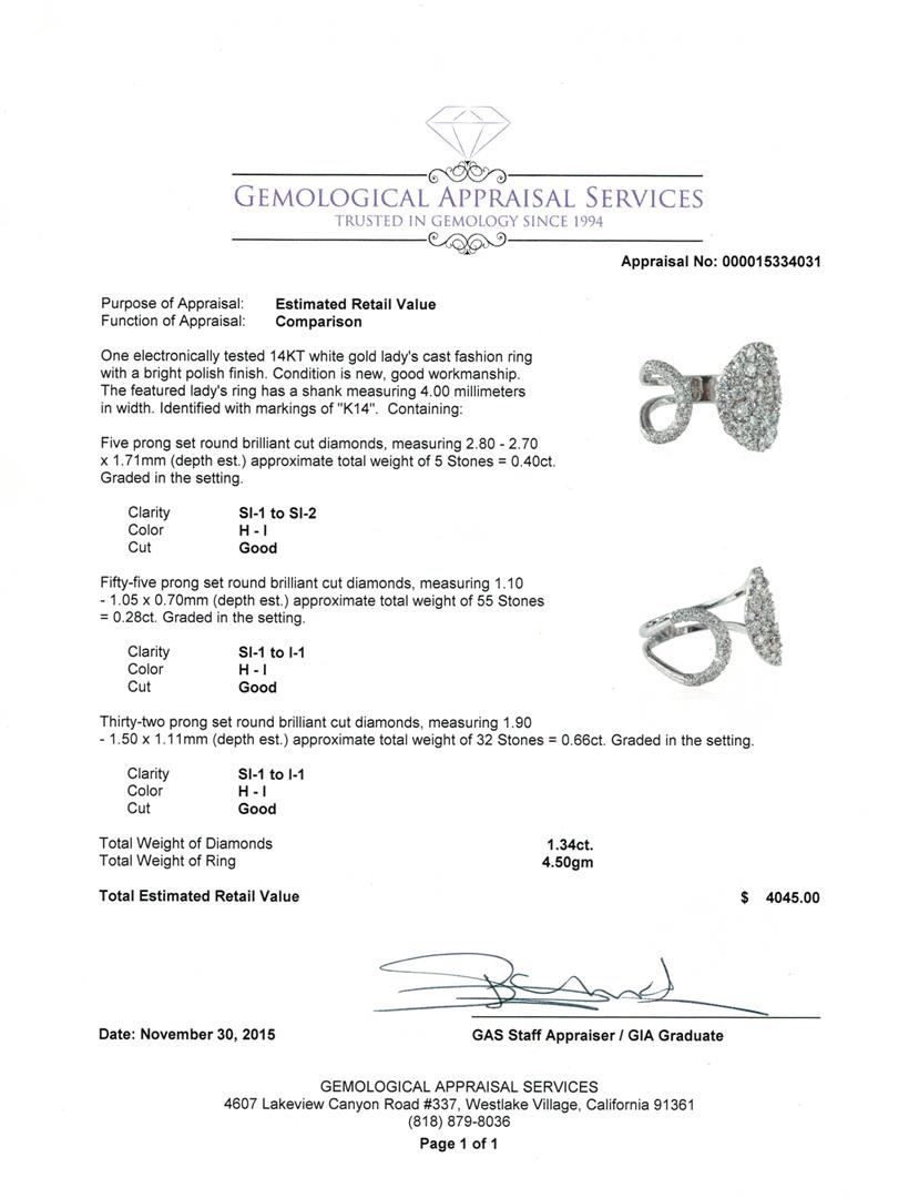 One electronically tested 14KT white gold lady's cast fashion ring with a bright polish finish. The featured lady's ring has a shank measuring 4.00 millimeters in width. Identified with markings of "K14". Condition is new, good workmanship. Containing: Five prong set round brilliant cut diamonds, measuring 2.80 - 2.70 x 1.71mm (depth est.) approximate total weight of 5 Stones = 0.40ct. Graded in the setting. Clarity: SI-1 to SI-2 . Color: H - I. Cut Good Fifty-Five prong set round brilliant cut diamonds, measuring 1.10 - 1.05 x 0.70mm (depth est.) approximate total weight of 55 Stones = 0.28ct. Graded in the setting. Clarity: SI-1 to I-1 . Color: H - I. Cut Good Thirty-Two prong set round brilliant cut diamonds, measuring 1.90 - 1.50 x 1.11mm (depth est.) approximate total weight of 32 Stones = 0.66ct. Graded in the setting. Clarity: SI-1 to I-1 . Color: H - I. Cut Good. Total Weight of Diamonds 1.34ct.. Total Weight of Ring 4.50gm at $ 4045.00 GAS Appraised.