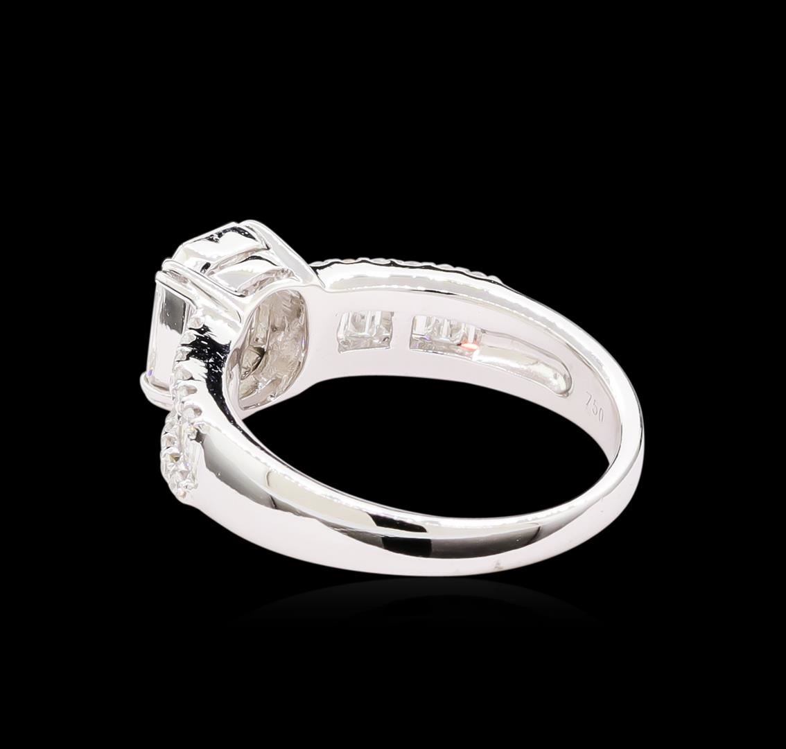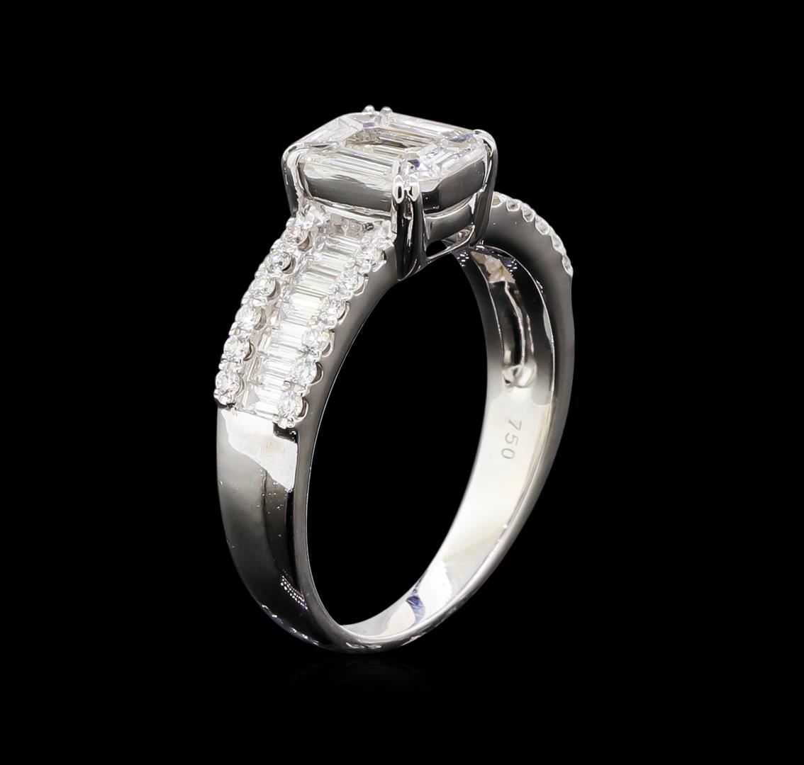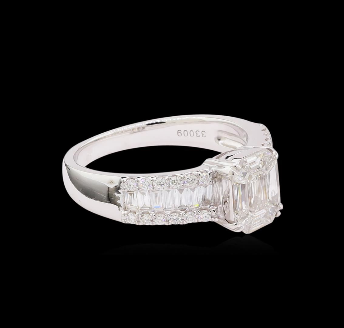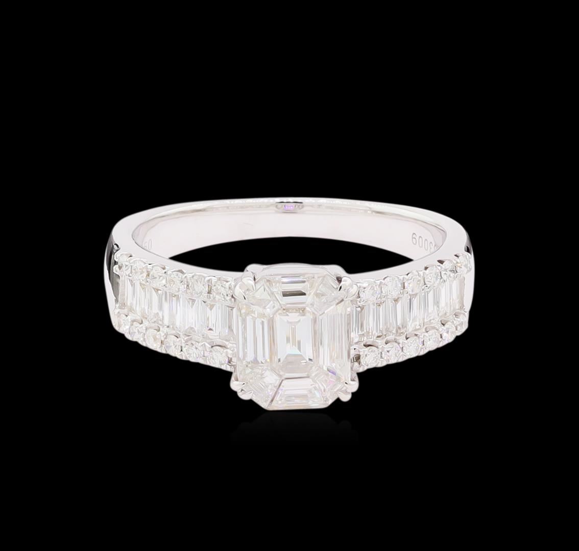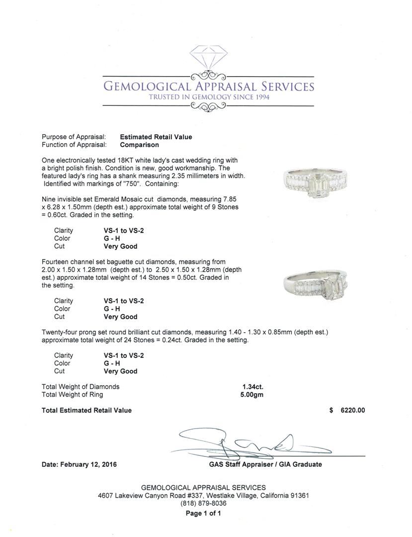 One electronically tested 18KT white lady's cast wedding ring with a bright polish finish. The featured lady's ring has a shank measuring 2.35 millimeters in width. Identified with markings of "750". Condition is new, good workmanship. Containing: Nine invisible set Emerald Mosaic cut diamonds, measuring 7.85 x 6.28 x 1.50mm (depth est.) approximate total weight of 9 Stones = 0.60ct. Graded in the setting. Clarity: VS-1 to VS-2. Color: G - Very Good Fourteen channel set baguette cut diamonds, measuring from 2.00 x 1.50 x 1.28mm (depth est.) to 2.50 x 1.50 x 1.28mm (depth est.) approximate total weight of 14 Stones = 0.50ct. Graded in the setting. Clarity: VS-1 to VS-2. Color: G - Very Good Twenty-Four prong set round brilliant cut diamonds, measuring 1.40 - 1.30 x 0.85mm (depth est.) approximate total weight of 24 Stones = 0.24ct. Graded in the setting. Clarity: VS-1 to VS-2. Color: G - Very Good. Total Weight of Diamonds 1.34ct. Total Weight of Ring 5.00gm. GAS Appraised at $6,220.00.
