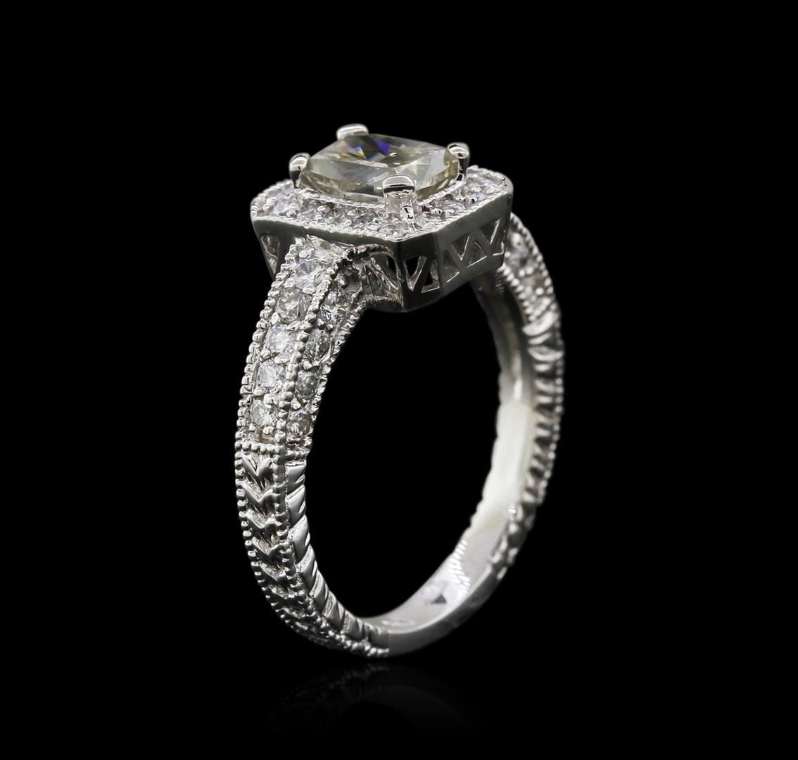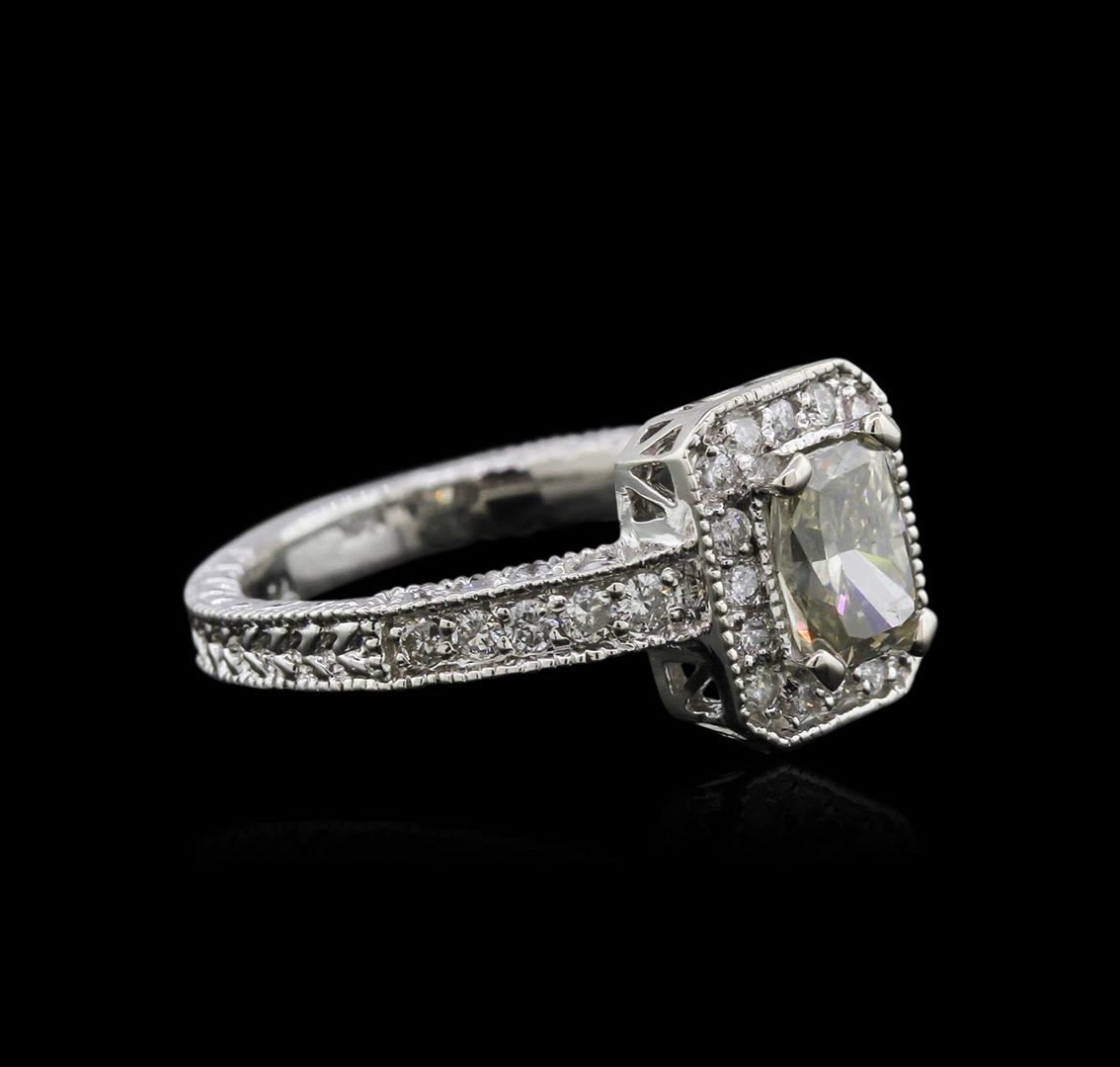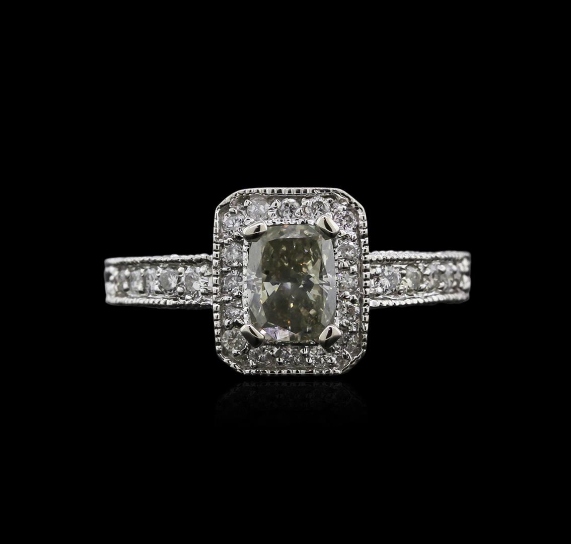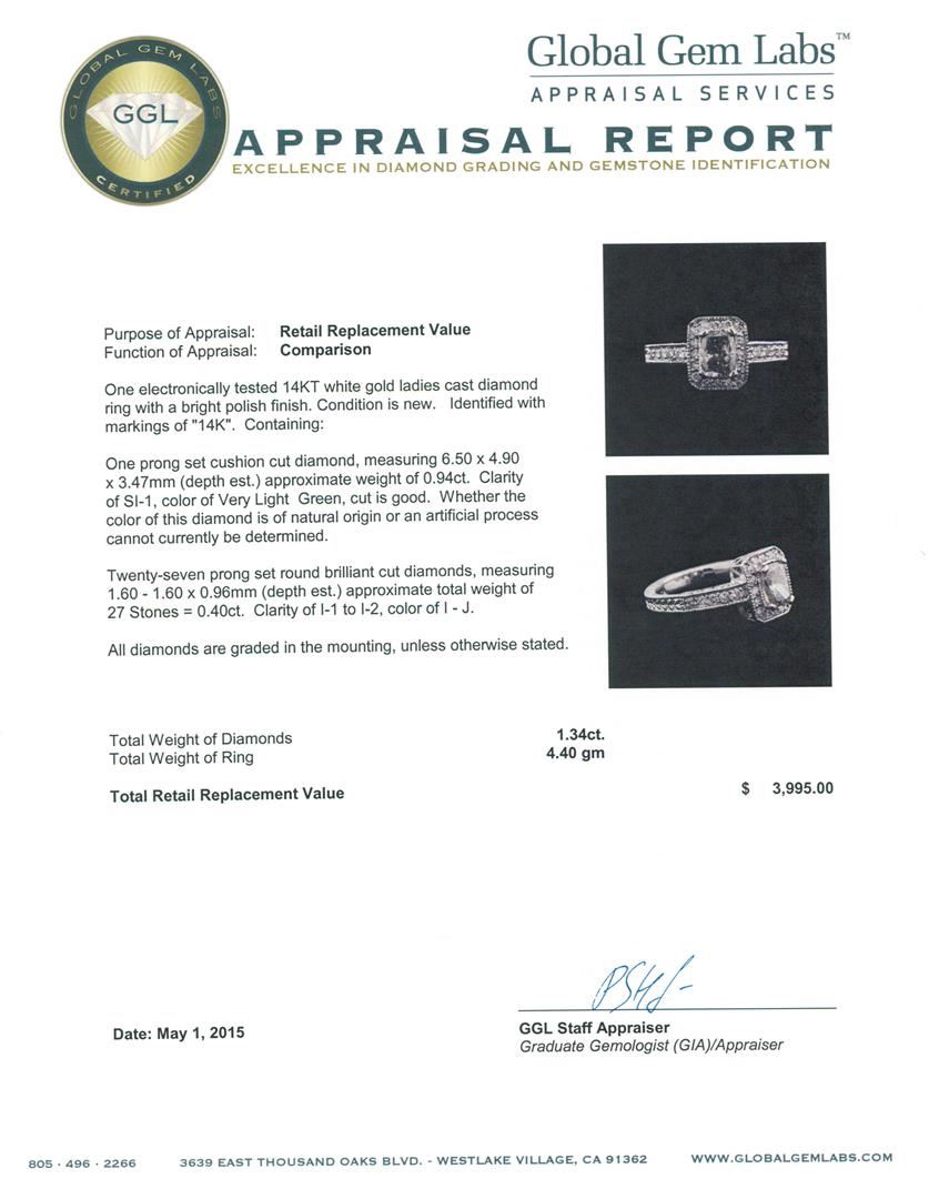 One electronically tested 14KT white gold ladies cast diamond ring with a bright polish finish. Condition is new. Identified markings of "14K". Containing: One prong set cushion cut diamond, measuring 6.50 x 4.90 x 3.47mm (depth est.) approximate weight of 0.94. Clarity of SI-1, color of Very Light Green, cut is good. Whether the color of this diamond is of natural origin or an artificial process cannot currently be determined. Twenty-seven prong set round brilliant cut diamonds, measuring 1.60 - 1.60 x 0.96mm (depth est.) approximate total weight of 27 Stones = 0.40ct. Clarity of I-1 to I-2, color of I - J. All diamonds are graded in the mounting, unless otherwise stated. Total Weight of Diamonds: 1.34ct. Total Weight of Ring: 4.40 gm. GGL Appraised at $3,995.00.