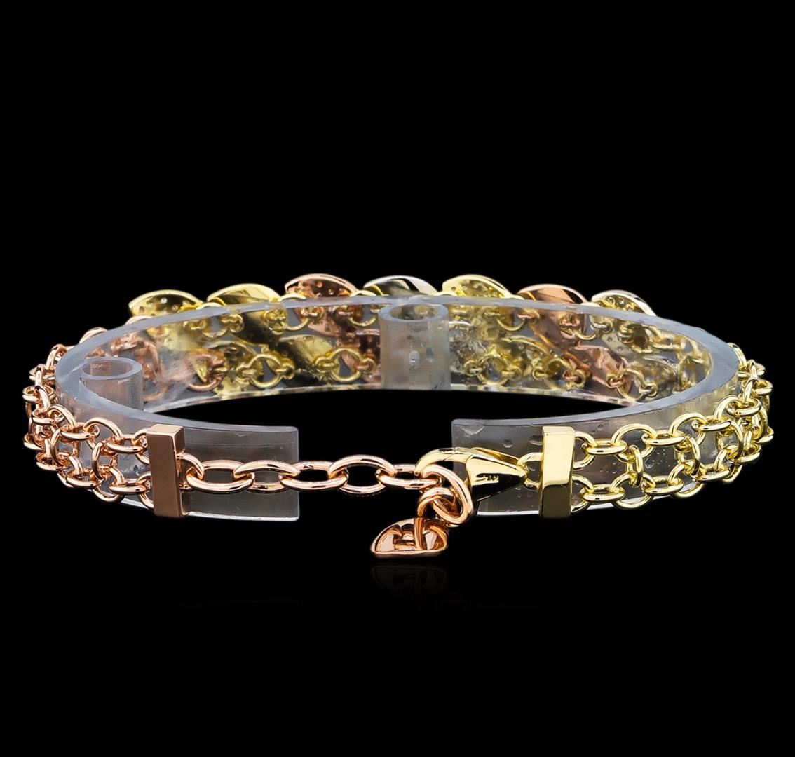 One electronically tested 14KT yellow, white, and rose gold lady's combination cast & assembled fashion bracelet with a lobster claw clasp with a bright polish finish. The featured lady's bracelet has an adjustable length measuring between 7 and 8 inches long. Identified with markings of "K14". Condition is new, good workmanship. Containing: One Hundred Fifty-Two prong set round brilliant cut diamonds, measuring 1.35 - 1.30 x 0.82mm (depth est.) approximate total weight of 152 Stones = 1.35ct. Graded in the setting. Clarity: SI-1 to I-1. Color: H - I. Cut Good. Total Weight of Diamonds 1.35ct. Total Weight of Bracelet 18.10gm. GAS Appraised at $7,815.00.