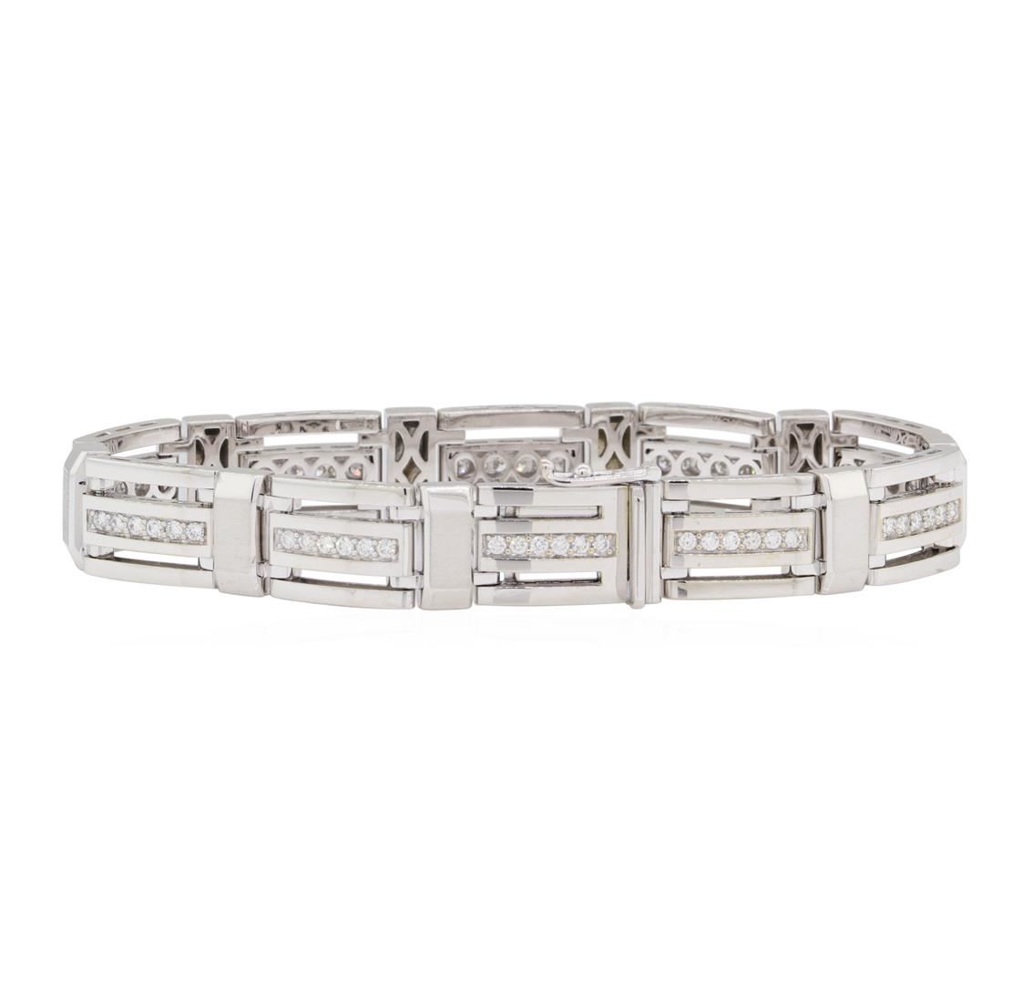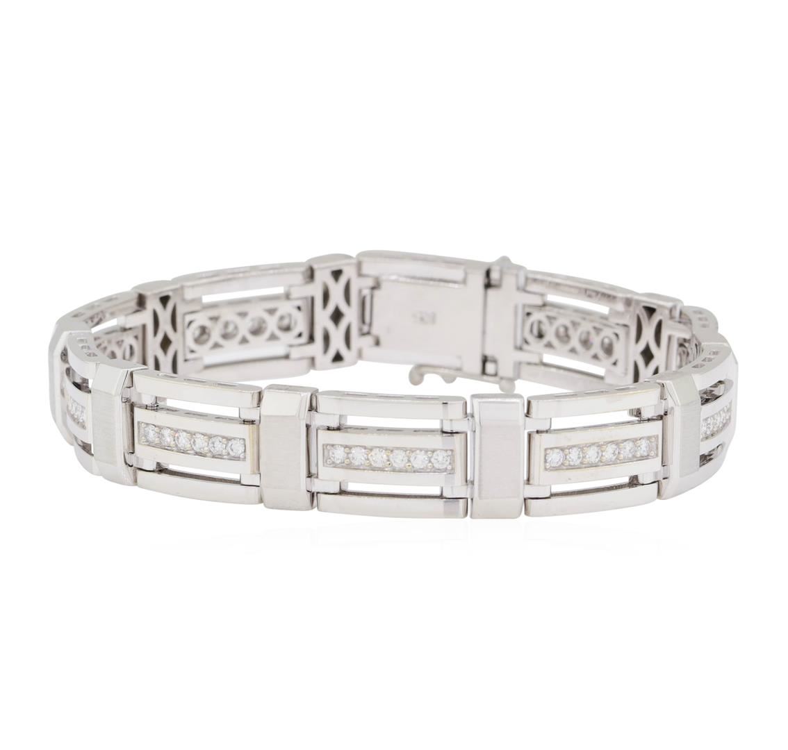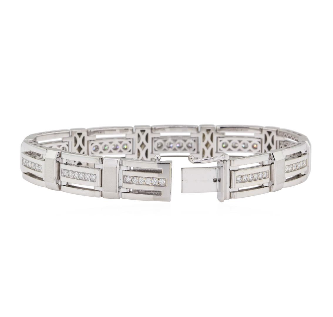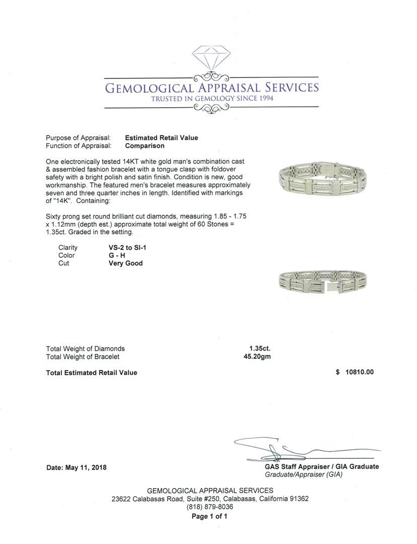One electronically tested 14KT white gold man's combination cast & assembled fashion bracelet with a tongue clasp with foldover safety with a bright polish and satin finish. The featured men's bracelet measures approximately seven and three quarter inches in length. Identified with markings of '14K'. Condition is new, good workmanship. Containing: Sixty prong set round brilliant cut diamonds, measuring 1.85 - 1.75 x 1.12mm (depth est.) approximate total weight of 60 Stones = 1.35ct. Graded in the setting. Color G - H Clarity VS-2 to SI-1 Cut Very Good. Total Weight of Diamonds 1.35ct.. Total Weight of Bracelet 45.20gm GAS Appraised at $10810.00. GAS Appraised at $10,810.00.