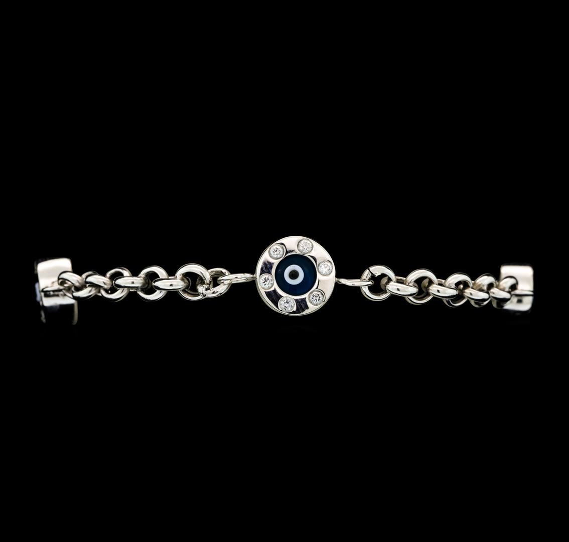 One electronically tested 14KT white gold lady's combination cast & assembled fashion evil eye bracelet with a lobster claw clasp with a bright polish finish. The featured lady's evil eye bracelet has four bezel set evil eye beads and a 5mm rolo link chain that measures approximately seven and a half inches in length. Identified with markings of '14K'. Condition is new, good workmanship. Containing: Forty-Eight bezel set round brilliant cut diamonds, measuring 2.00 - 1.90 x 1.21mm (depth est.) approximate total weight of 48 Stones = 1.35ct. Graded in the setting. Clarity VS-2 to SI-1. Color: H - I Cut Very Good. Total Weight of Diamonds 1.35ct.. Total Weight of Bracelet 12.60gm GAS Appraised at $4,365.00.
