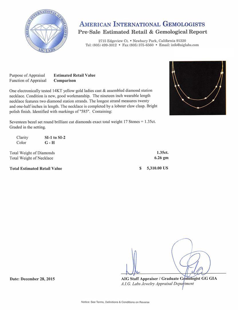 One electronically tested 14KT yellow gold ladies cast & assembled diamond station necklace. The nineteen inch wearable length necklace features two diamond station strands. The longest strand measures twenty and one-half inches in length. The necklace is completed by a lobster claw clasp. Bright polish finish. Identified with markings of "585". Condition is new, good workmanship. Containing: Seventeen bezel set round brilliant cut diamonds exact total weight 17 Stones = 1.35ct. Graded in the setting. Clarity: SI-1 to SI-2. Color: G - H. Total Weight of Diamonds 1.35ct. Total Weight of Necklace 6.26gm. AIG Appraised at $5,310.00.