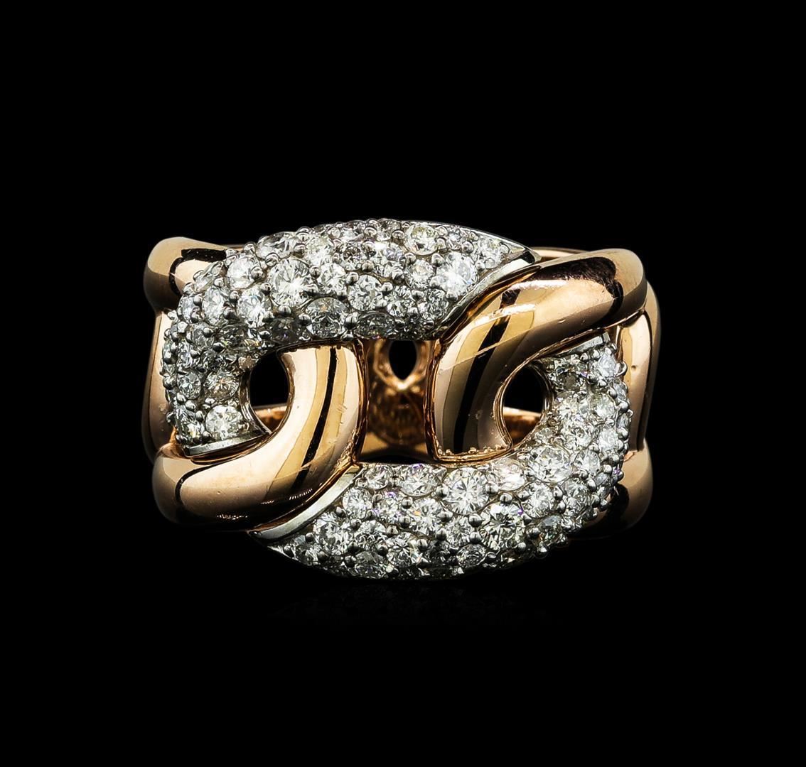 One electronically tested 14KT rose and white gold lady's combination cast & assembled fashion ring with a bright polish finish. The featured ladies ring is constructed of, five interlocking tapered links with a shank measuring 8.58 millimeters in width. Identified with markings of 'K14'. Condition is new, good workmanship. Containing: Eighteen prong set round brilliant cut diamonds, measuring 2.00 - 1.90 x 1.21mm (depth est.) approximate total weight of 18 Stones = 0.53ct. Graded in the setting. Clarity SI-1 to SI-2. Color: H - I Cut Good Seventy prong set round brilliant cut diamonds, measuring 1.55 - 1.40 x 0.92mm (depth est.) approximate total weight of 70 Stones = 0.82ct. Graded in the setting. Clarity SI-1 to SI-2. Color: H - I Cut Good. Total Weight of Diamonds 1.35ct.. Total Weight of Ring 8.60gm GAS Appraised.