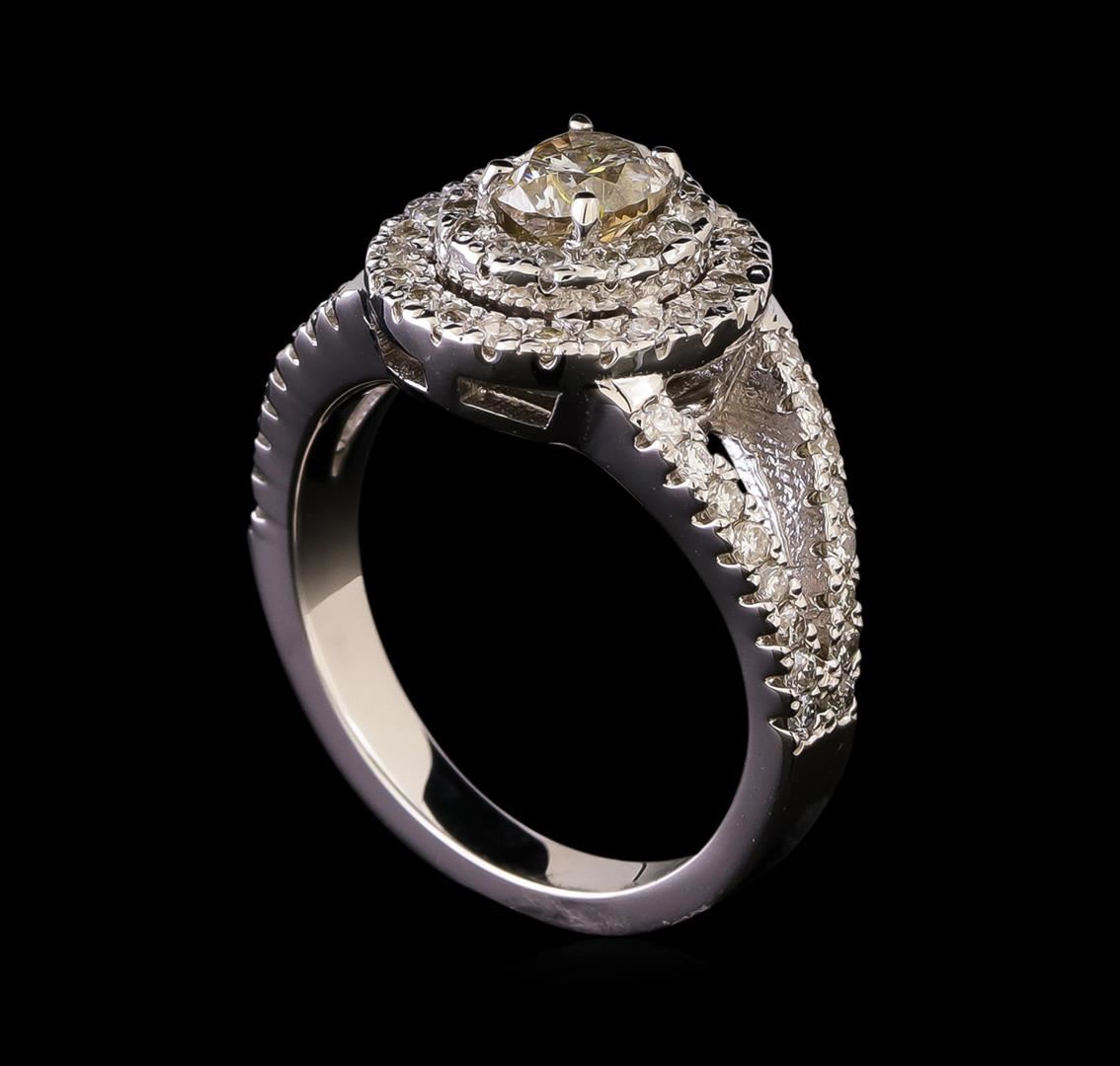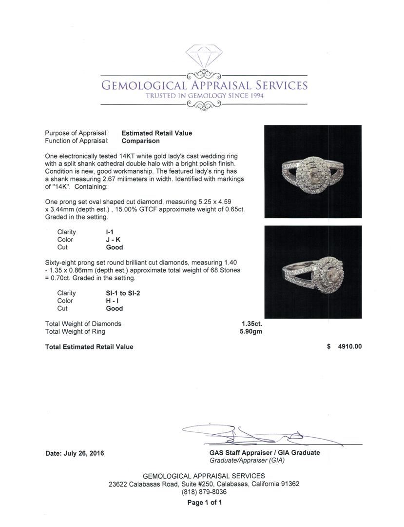 One electronically tested 14KT white gold lady's cast wedding ring with a split shank cathedral double halo with a bright polish finish. The featured lady's ring has a shank measuring 2.67 millimeters in width. Identified with markings of '14K'. Condition is new, good workmanship. Containing: One prong set oval shaped cut diamond, measuring 5.25 x 4.59 x 3.44mm (depth est.) , 15.00.%. GTCF approximate weight of 0.65ct. Graded in the setting. Clarity I-1. Color: J - K Cut Good Sixty-Eight prong set round brilliant cut diamonds, measuring 1.40 - 1.35 x 0.86mm (depth est.) approximate total weight of 68 Stones = 0.70ct. Graded in the setting. Clarity SI-1 to SI-2. Color: H - I Cut Good. Total Weight of Diamonds 1.35ct.. Total Weight of Ring 5.90gm. GAS Appraised at $4,910.00.