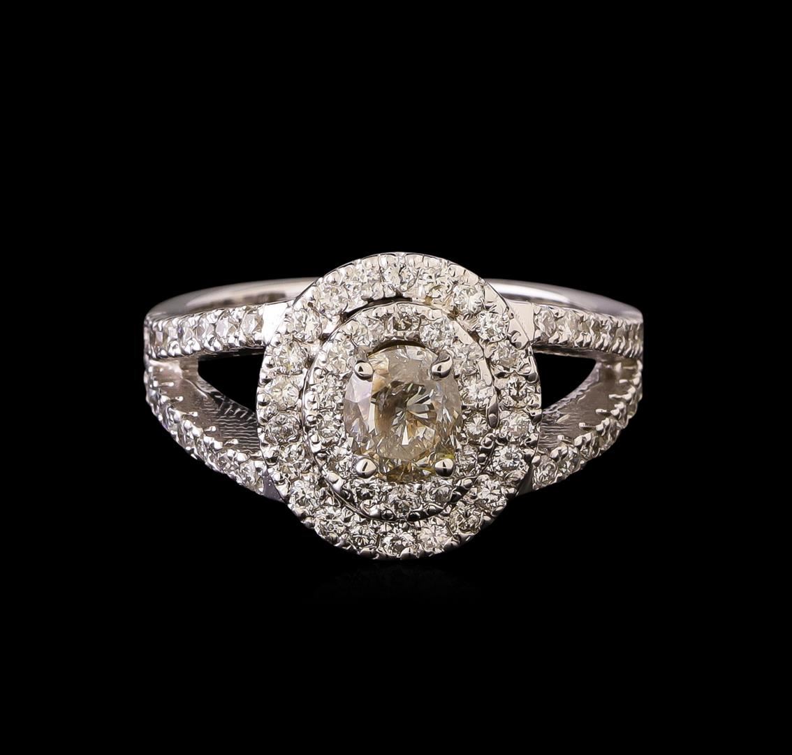 One electronically tested 14KT white gold lady's cast wedding ring with a split shank cathedral double halo with a bright polish finish. The featured lady's ring has a shank measuring 2.67 millimeters in width. Identified with markings of '14K'. Condition is new, good workmanship. Containing: One prong set oval shaped cut diamond, measuring 5.25 x 4.59 x 3.44mm (depth est.) , 15.00.%. GTCF approximate weight of 0.65ct. Graded in the setting. Clarity I-1. Color: J - K Cut Good Sixty-Eight prong set round brilliant cut diamonds, measuring 1.40 - 1.35 x 0.86mm (depth est.) approximate total weight of 68 Stones = 0.70ct. Graded in the setting. Clarity SI-1 to SI-2. Color: H - I Cut Good. Total Weight of Diamonds 1.35ct.. Total Weight of Ring 5.90gm. GAS Appraised at $4,910.00.
