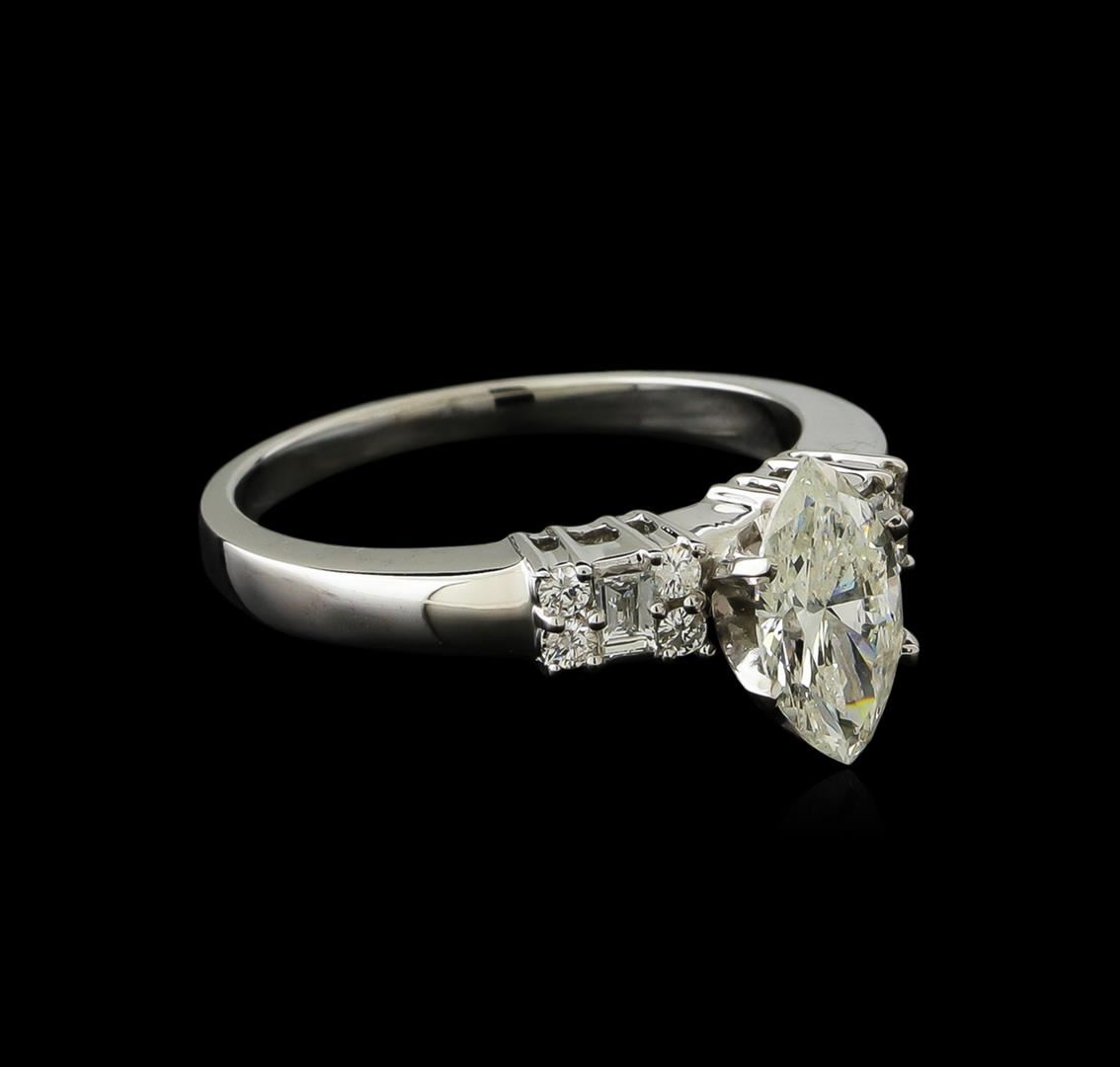 One electronically tested 14KT white gold ladies cast diamond unity ring with a bright polish finish. The featured diamond is set between mirroring stylized diamond galleries, completed by a one and one-half millimeter wide band. Identified with markings of "14K". Condition is new, good workmanship. Containing: One prong set marquise shaped cut diamond, measuring 9.90 x 5.20 x 3.20mm (depth est.) approximate weight of 1.05ct. Graded in the setting. Clarity: I-2. Color: I. Depth 61.5%. Table 59.6%. Two prong set emerald cut diamonds, measuring 2.60 x 1.90 x 1.33mm (depth est.) approximate total weight of 2 Stones = 0.15ct. Graded in the setting. Clarity: SI-2 to I-1. Color: G Eight prong set round brilliant cut diamonds, measuring 1.60 - 1.60 x 0.96mm (depth est.) approximate total weight of 8 Stones = 0.15ct. Graded in the setting. Clarity: SI-2 to I-2. Color: G - I. Total Weight of Diamonds 1.35ct. Total Weight of Ring 4.54gm. AIG Appraised at $6,200.00.