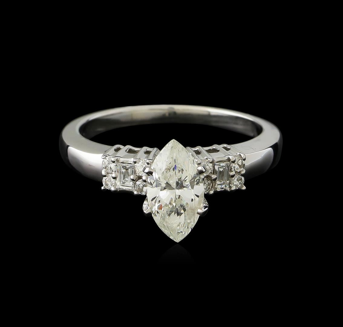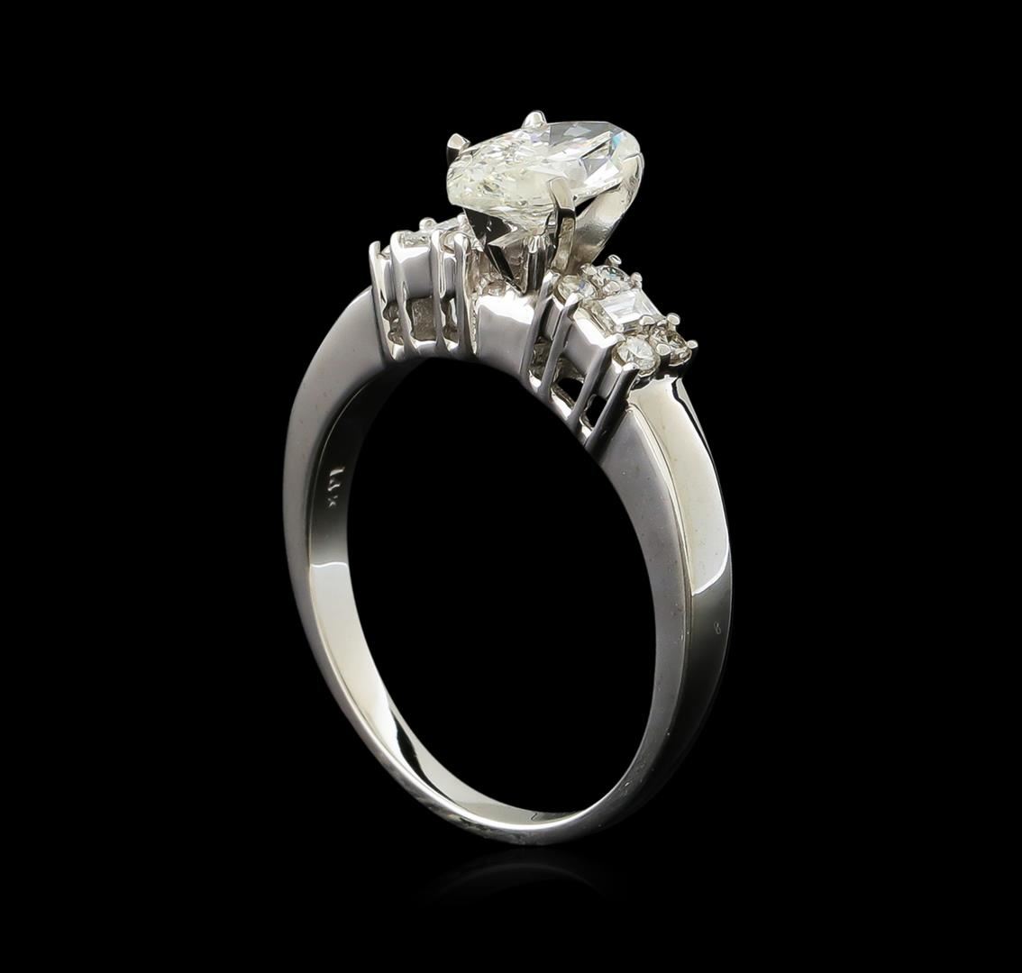One electronically tested 14KT white gold ladies cast diamond unity ring with a bright polish finish. The featured diamond is set between mirroring stylized diamond galleries, completed by a one and one-half millimeter wide band. Identified with markings of "14K". Condition is new, good workmanship. Containing: One prong set marquise shaped cut diamond, measuring 9.90 x 5.20 x 3.20mm (depth est.) approximate weight of 1.05ct. Graded in the setting. Clarity: I-2. Color: I. Depth 61.5%. Table 59.6%. Two prong set emerald cut diamonds, measuring 2.60 x 1.90 x 1.33mm (depth est.) approximate total weight of 2 Stones = 0.15ct. Graded in the setting. Clarity: SI-2 to I-1. Color: G Eight prong set round brilliant cut diamonds, measuring 1.60 - 1.60 x 0.96mm (depth est.) approximate total weight of 8 Stones = 0.15ct. Graded in the setting. Clarity: SI-2 to I-2. Color: G - I. Total Weight of Diamonds 1.35ct. Total Weight of Ring 4.54gm. AIG Appraised at $6,200.00.