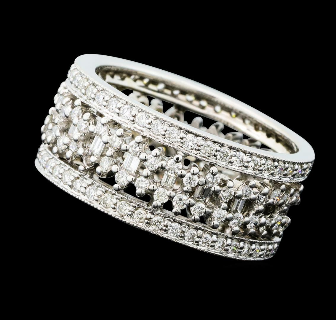One electronically tested 14KT white gold lady's cast fashion ring with a wide band with a bright polish with milgrain detailing finish. The featured lady's ring has a shank measuring 8.75 millimeters wide. Identified with markings of '14K 585'. Condition is new, good workmanship. Containing: Seventeen prong set baguette cut diamonds, measuring from 1.30 x 1.00 x 0.85mm (depth est.) to 1.40 x 1.05 x 0.89mm (depth est.) approximate total weight of 17 Stones = 0.20ct. Graded in the setting. Clarity VS-2 to SI-1. Color: H - I Cut Very Good One Hundred Forty-Four prong set round brilliant cut diamonds, measuring 1.30 - 1.25 x 0.79mm (depth est.) approximate total weight of 144 Stones = 1.15ct. Graded in the setting. Clarity SI-1 to SI-2. Color: H - I Cut Good. Total Weight of Diamonds 1.35ct.. Total Weight of Ring 6.40gm GAS Appraised at $4,760.00.