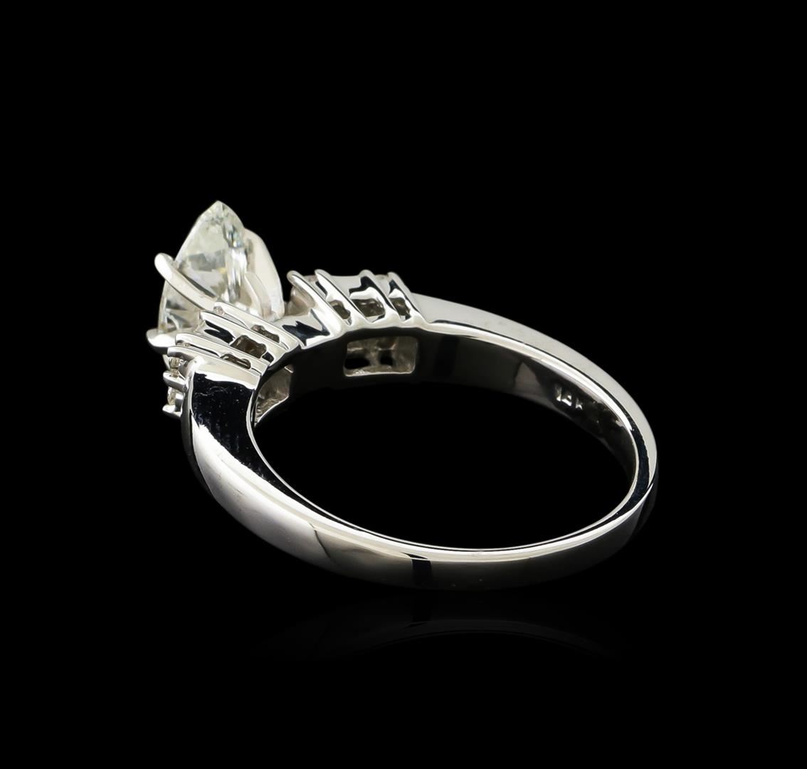 One electronically tested 14KT white gold ladies cast diamond unity ring with a bright polish finish. The featured diamond is set between mirroring stylized diamond galleries, completed by a one and one-half millimeter wide band. Identified with markings of "14K". Condition is new, good workmanship. Containing: One prong set marquise shaped cut diamond, measuring 9.90 x 5.20 x 3.20mm (depth est.) approximate weight of 1.05ct. Graded in the setting. Clarity: I-2. Color: I. Depth 61.5%. Table 59.6%. Two prong set emerald cut diamonds, measuring 2.60 x 1.90 x 1.33mm (depth est.) approximate total weight of 2 Stones = 0.15ct. Graded in the setting. Clarity: SI-2 to I-1. Color: G Eight prong set round brilliant cut diamonds, measuring 1.60 - 1.60 x 0.96mm (depth est.) approximate total weight of 8 Stones = 0.15ct. Graded in the setting. Clarity: SI-2 to I-2. Color: G - I. Total Weight of Diamonds 1.35ct. Total Weight of Ring 4.54gm. AIG Appraised at $6,200.00.