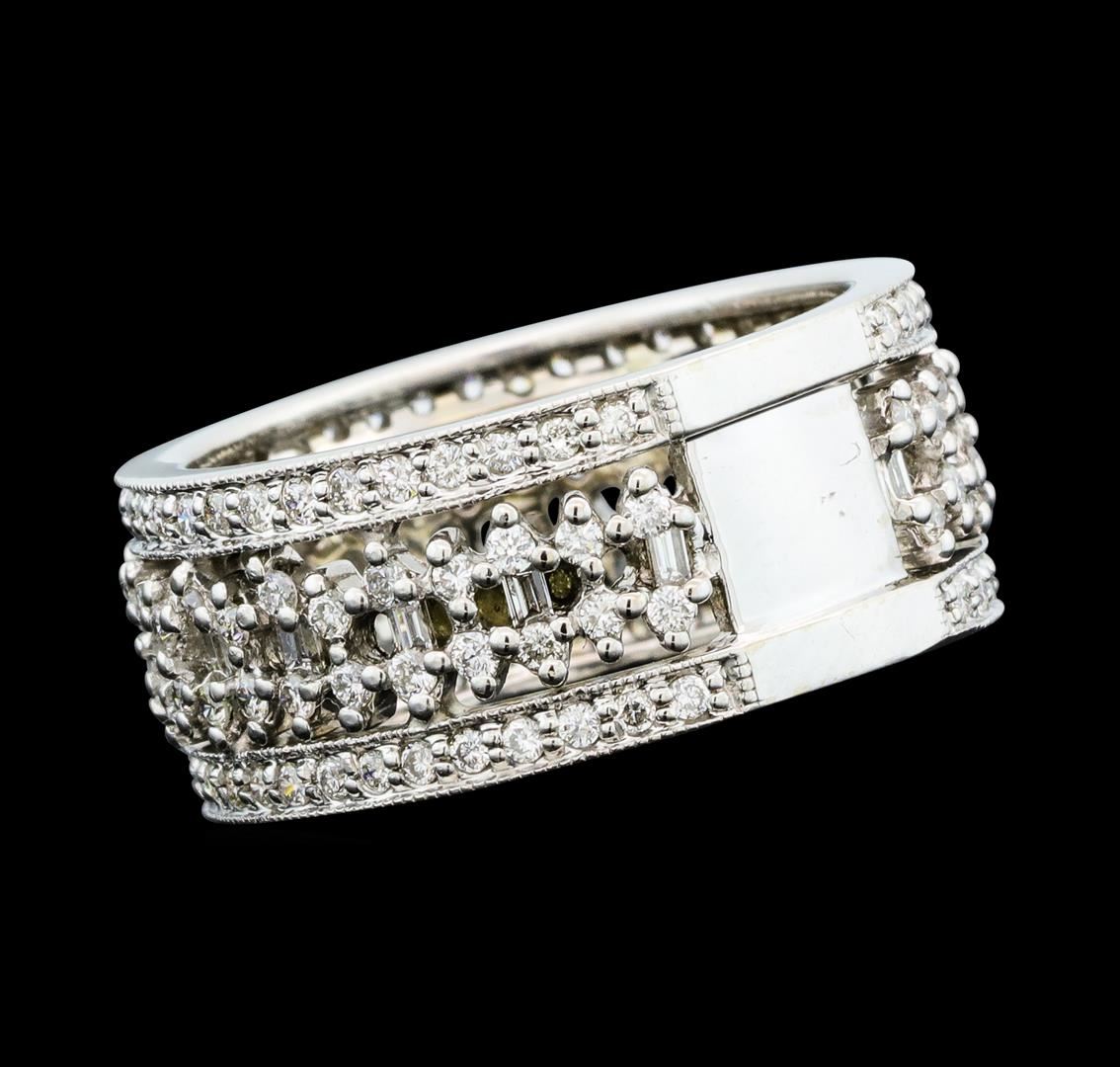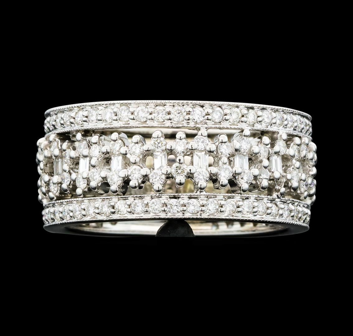 One electronically tested 14KT white gold lady's cast fashion ring with a wide band with a bright polish with milgrain detailing finish. The featured lady's ring has a shank measuring 8.75 millimeters wide. Identified with markings of '14K 585'. Condition is new, good workmanship. Containing: Seventeen prong set baguette cut diamonds, measuring from 1.30 x 1.00 x 0.85mm (depth est.) to 1.40 x 1.05 x 0.89mm (depth est.) approximate total weight of 17 Stones = 0.20ct. Graded in the setting. Clarity VS-2 to SI-1. Color: H - I Cut Very Good One Hundred Forty-Four prong set round brilliant cut diamonds, measuring 1.30 - 1.25 x 0.79mm (depth est.) approximate total weight of 144 Stones = 1.15ct. Graded in the setting. Clarity SI-1 to SI-2. Color: H - I Cut Good. Total Weight of Diamonds 1.35ct.. Total Weight of Ring 6.40gm GAS Appraised at $4,760.00.