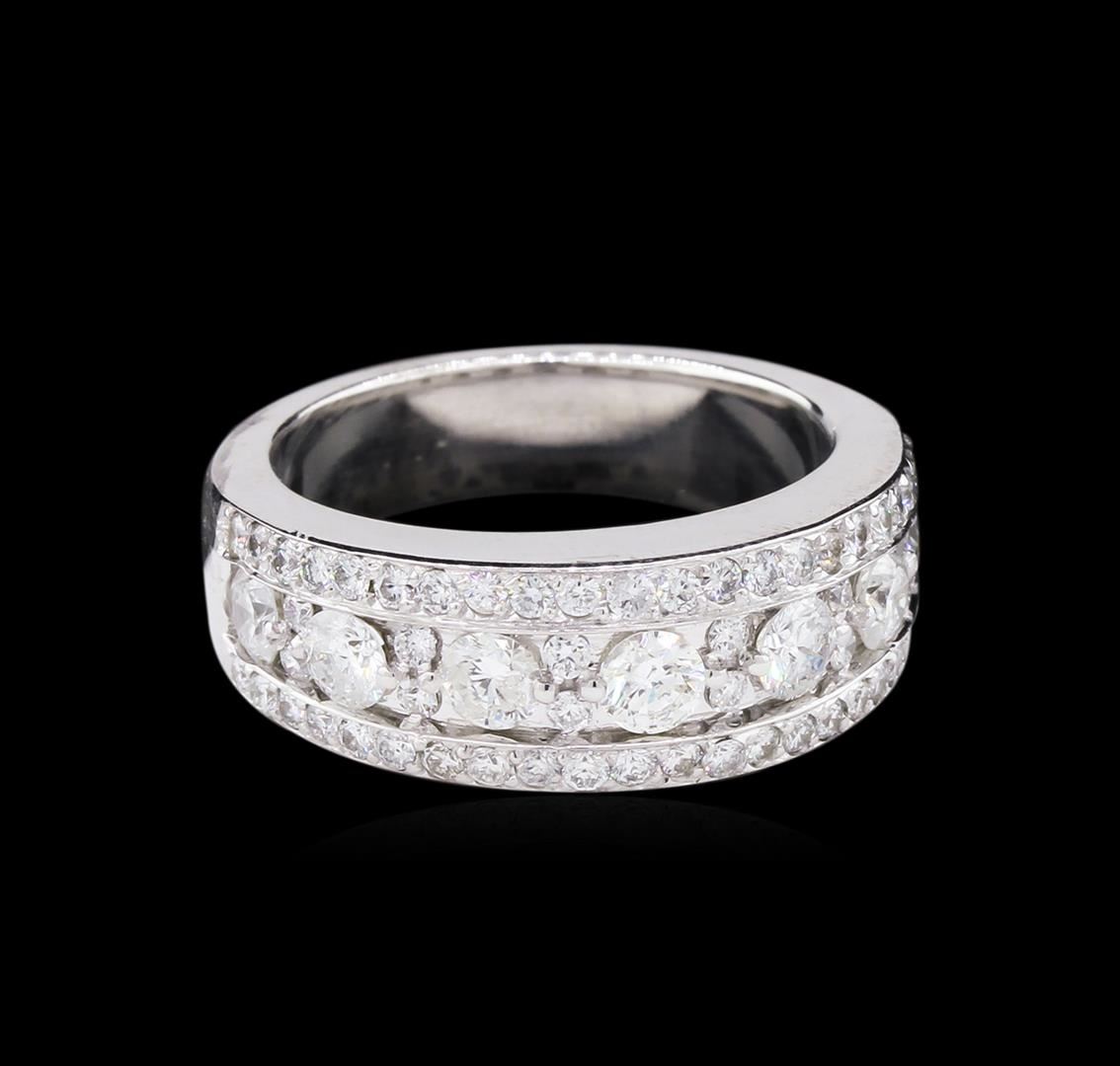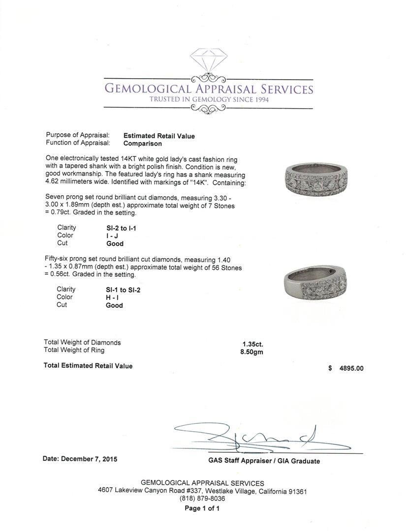 One electronically tested 14KT white gold lady's cast fashion ring with a tapered shank with a bright polish finish. The featured lady's ring has a shank measuring 4.62 millimeters wide. Identified with markings of "14K". Condition is new, good workmanship. Containing: Seven prong set round brilliant cut diamonds, measuring 3.30 - 3.00 x 1.89mm (depth est.) approximate total weight of 7 Stones = 0.79ct. Graded in the setting. Clarity: SI-2 to I-1. Color: I - J. Cut Good Fifty-Six prong set round brilliant cut diamonds, measuring 1.40 - 1.35 x 0.87mm (depth est.) approximate total weight of 56 Stones = 0.56ct. Graded in the setting. Clarity: SI-1 to SI-2. Color: H - I. Cut Good. Total Weight of Diamonds 1.35ct. Total Weight of Ring 8.50gm. GAS Appraised at $4,895.00.