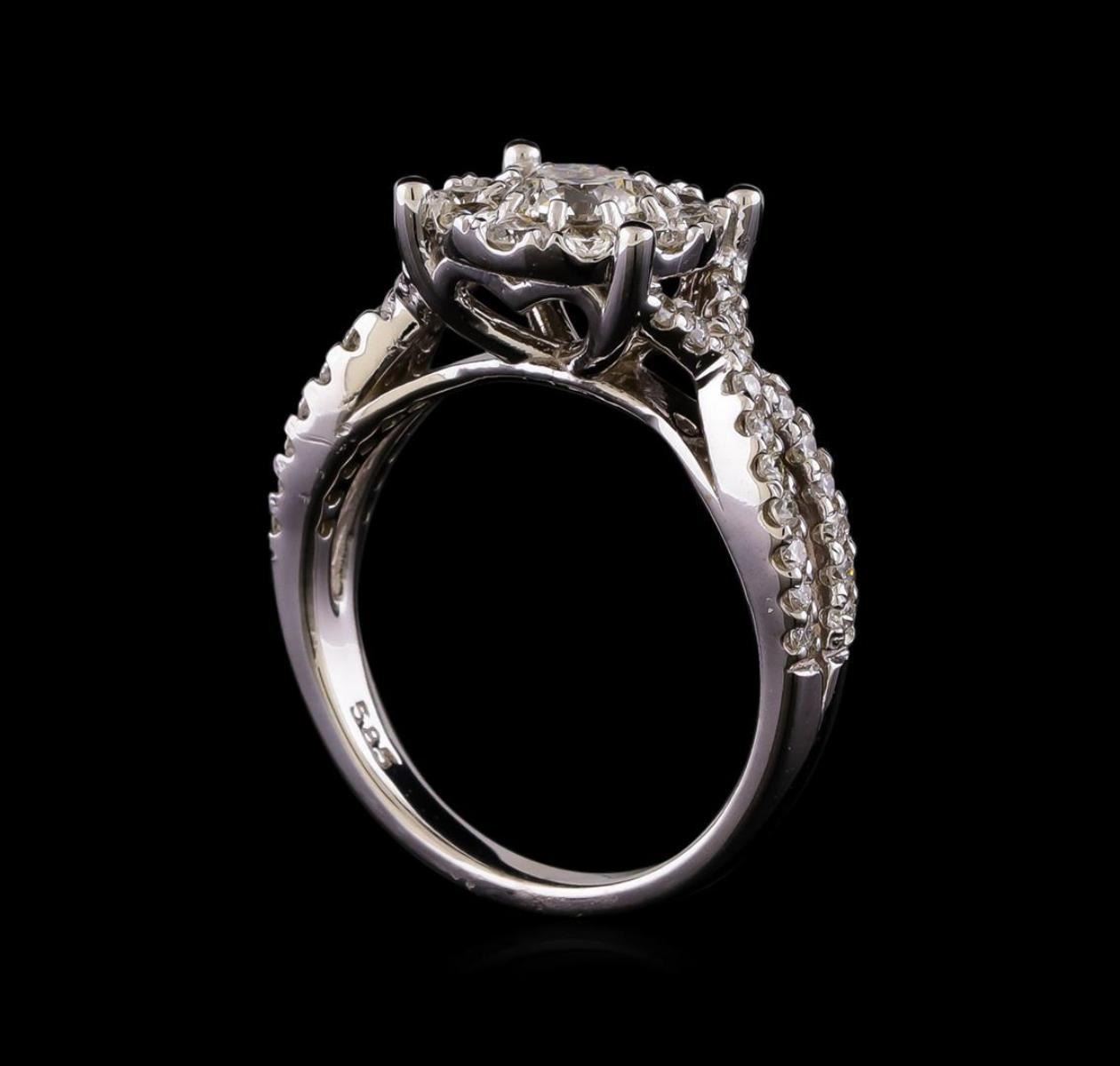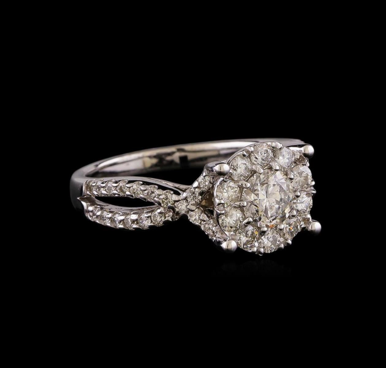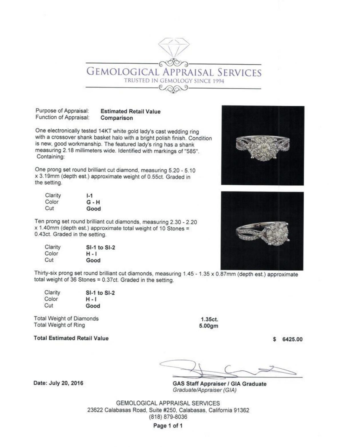 One electronically tested 14KT white gold lady's cast wedding ring with a crossover shank basket halo with a bright polish finish. The featured lady's ring has a shank measuring 2.18 millimeters wide. Identified with markings of '585'. Condition is new, good workmanship. Containing: One prong set round brilliant cut diamond, measuring 5.20 - 5.10 x 3.19mm (depth est.) approximate weight of 0.55ct. Graded in the setting. Clarity I-1. Color: G - H Cut Good Ten prong set round brilliant cut diamonds, measuring 2.30 - 2.20 x 1.40mm (depth est.) approximate total weight of 10 Stones = 0.43ct. Graded in the setting. Clarity SI-1 to SI-2. Color: H - I Cut Good Thirty-Six prong set round brilliant cut diamonds, measuring 1.45 - 1.35 x 0.87mm (depth est.) approximate total weight of 36 Stones = 0.37ct. Graded in the setting. Clarity SI-1 to SI-2. Color: H - I Cut Good. Total Weight of Diamonds 1.35ct.. Total Weight of Ring 5.00gm. GAS Appraised.