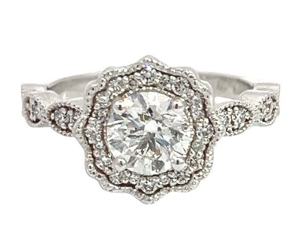 One electronically tested 14KT white gold lady's custom CAD/CAM wedding ring with a scalloped basket halo with a bright polish with migraine detailing finish. The featured lady's ring has a ribbon motif shank measuring 2.50 millimeters wide. Trademark is MJ. Identified with markings of "14K". Condition is new, good workmanship. Containing: One prong set round brilliant cut diamond, measuring 6.22 - 6.18 x 3.94mm (depth est.) approximate weight of 0.96ct. Graded loose prior to setting in the GIA Laboratory, Report #2213086126. Laser inscribed on girdle. Color G Clarity I-2 Cut Very Good Twelve prong set round brilliant cut diamonds, measuring 1.80 - 1.70 x 1.09mm (depth est.) approximate total weight of 12 Stones = 0.25ct. Graded in the setting. Color G - H Clarity VS-2 to SI-1 Cut Very Good Twenty prong set round brilliant cut diamonds, measuring 1.30 - 1.10 x 0.74mm (depth est.) approximate total weight of 20 Stones = 0.14ct. Graded in the setting. Color G - H Clarity VS-2 to SI-1 Cut Very Good Total Weight of Diamonds 1.35ct. Total Weight of Ring 4.20gm Estimated Retail Value $ 11800.00