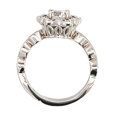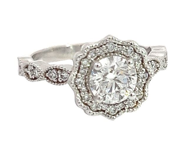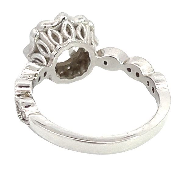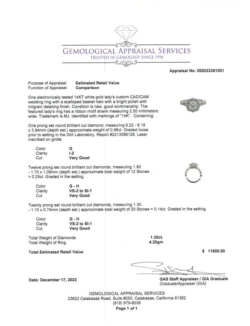 One electronically tested 14KT white gold lady's custom CAD/CAM wedding ring with a scalloped basket halo with a bright polish with migraine detailing finish. The featured lady's ring has a ribbon motif shank measuring 2.50 millimeters wide. Trademark is MJ. Identified with markings of "14K". Condition is new, good workmanship. Containing: One prong set round brilliant cut diamond, measuring 6.22 - 6.18 x 3.94mm (depth est.) approximate weight of 0.96ct. Graded loose prior to setting in the GIA Laboratory, Report #2213086126. Laser inscribed on girdle. Color G Clarity I-2 Cut Very Good Twelve prong set round brilliant cut diamonds, measuring 1.80 - 1.70 x 1.09mm (depth est.) approximate total weight of 12 Stones = 0.25ct. Graded in the setting. Color G - H Clarity VS-2 to SI-1 Cut Very Good Twenty prong set round brilliant cut diamonds, measuring 1.30 - 1.10 x 0.74mm (depth est.) approximate total weight of 20 Stones = 0.14ct. Graded in the setting. Color G - H Clarity VS-2 to SI-1 Cut Very Good Total Weight of Diamonds 1.35ct. Total Weight of Ring 4.20gm Estimated Retail Value $ 11800.00