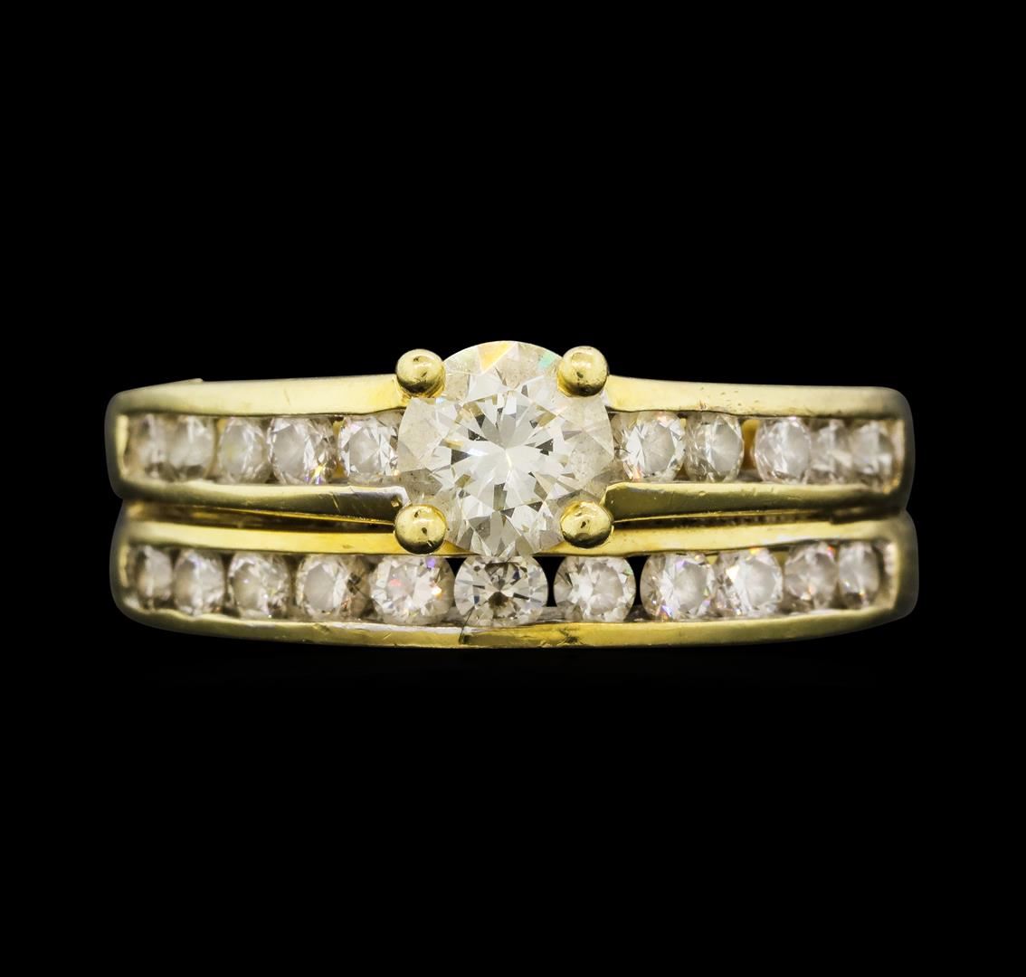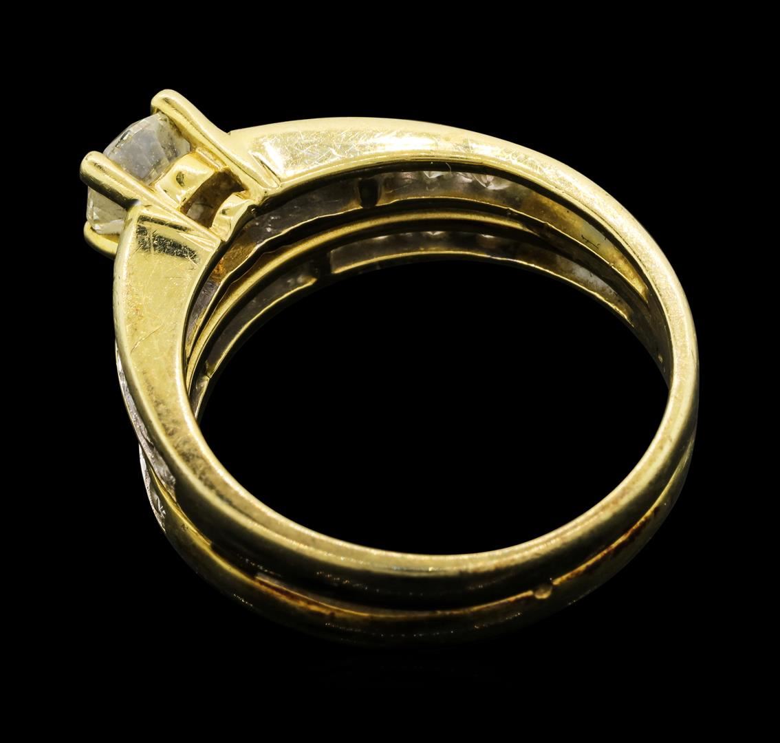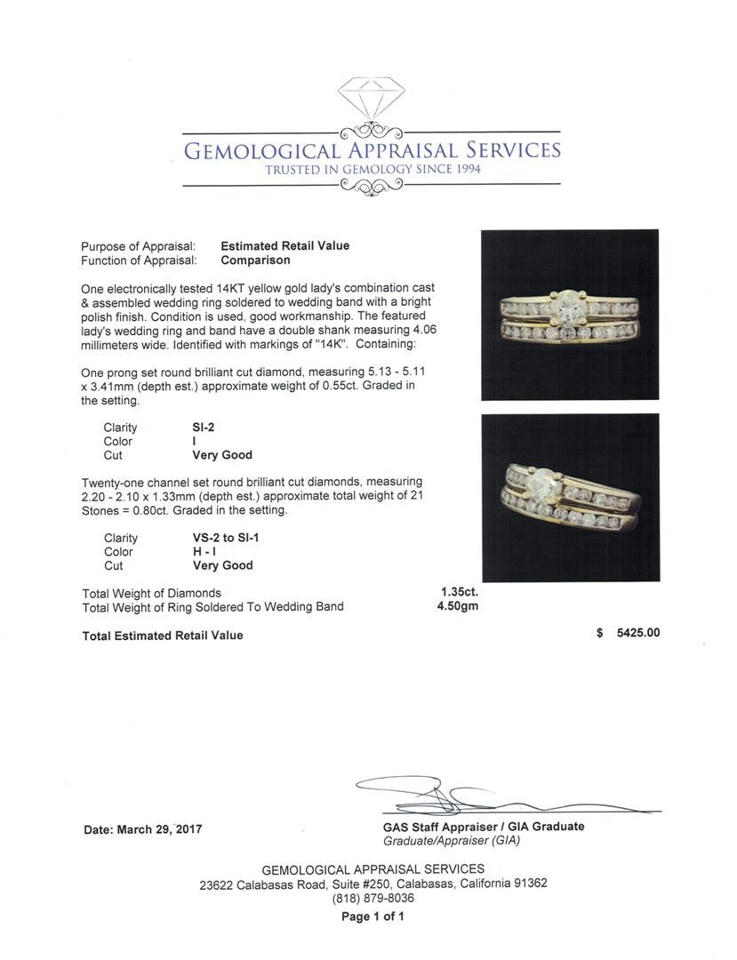 One electronically tested 14KT yellow gold lady's combination cast & assembled wedding ring soldered to wedding band with a bright polish finish. The featured lady's wedding ring and band have a double shank measuring 4.06 millimeters wide. Identified wit GAS Appraised at $5,425.00.